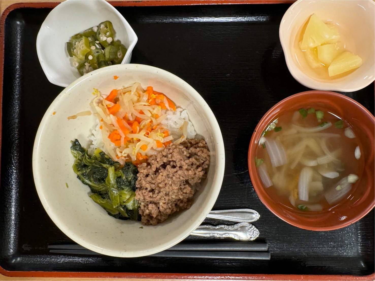 【昼食】 1.ビビンバご飯 2.オクラのポン酢和え 3.フルーツ缶 4.すまし汁