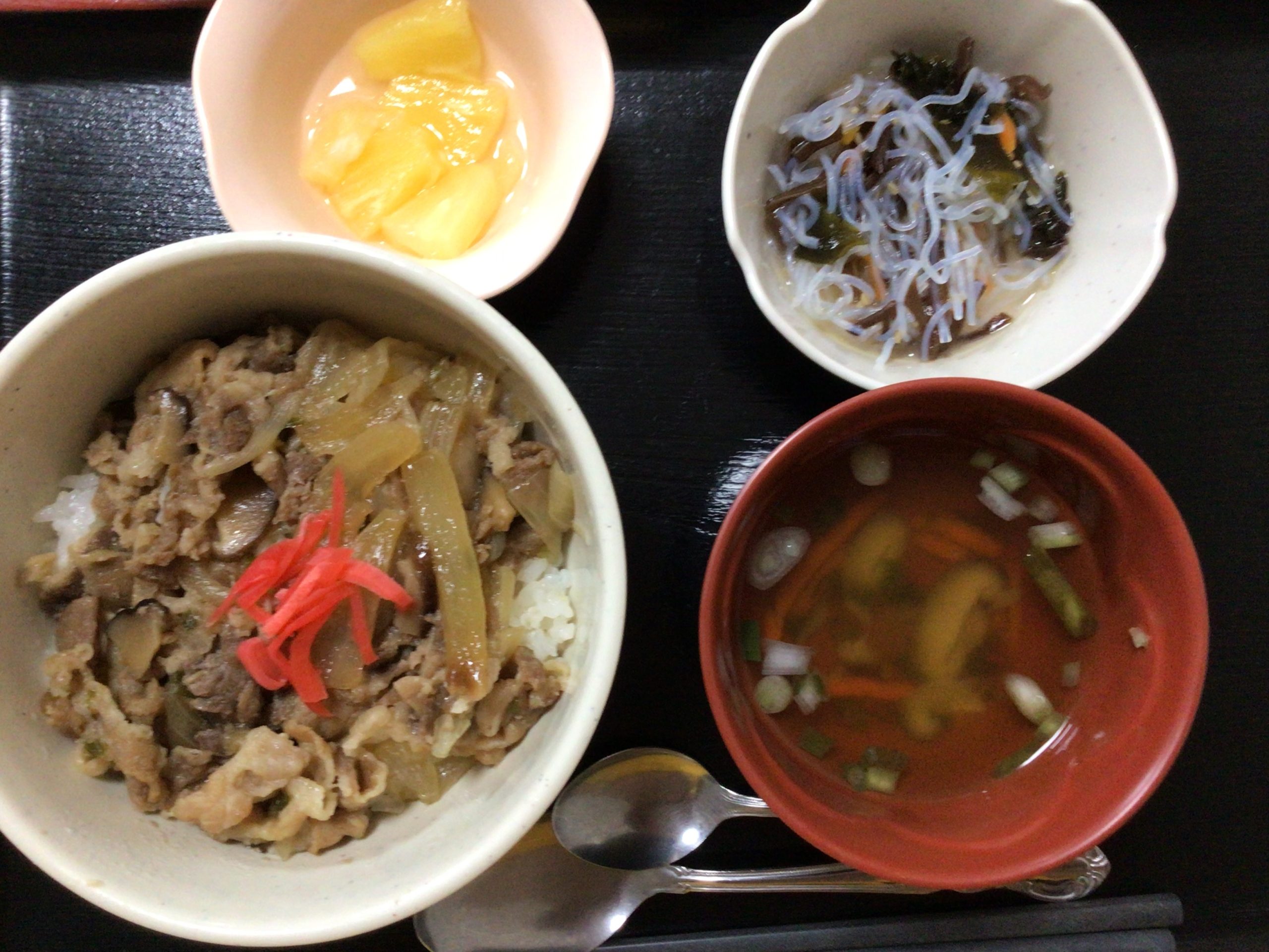 【昼食】 1.豚丼 2.春雨サラダ 3.フルーツ缶 4.すまし汁