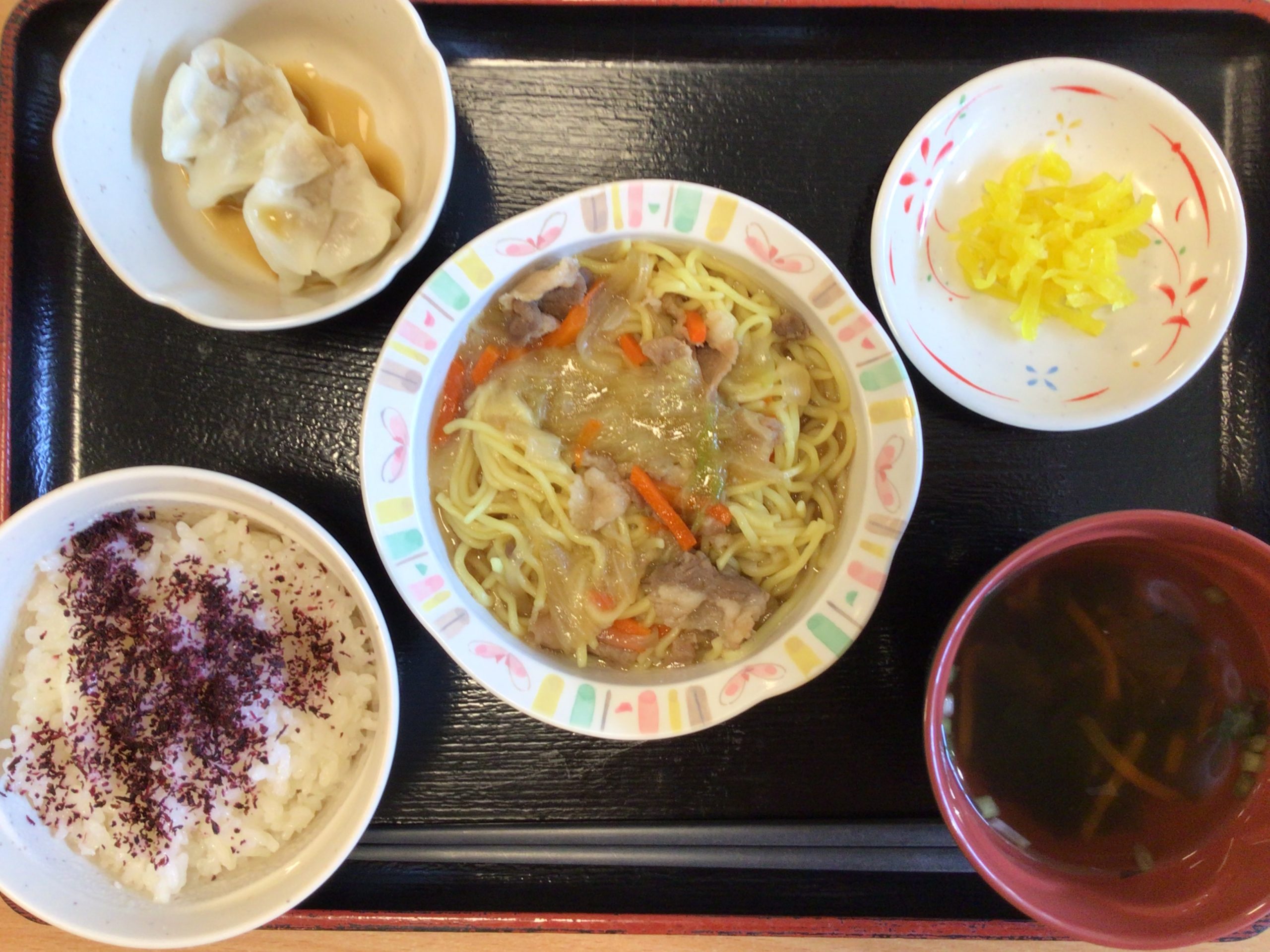 【昼食】 1.ゆかりご飯(小) 2.あんかけ焼きそば 3.蒸しシューマイ 4.漬物 5.すまし汁