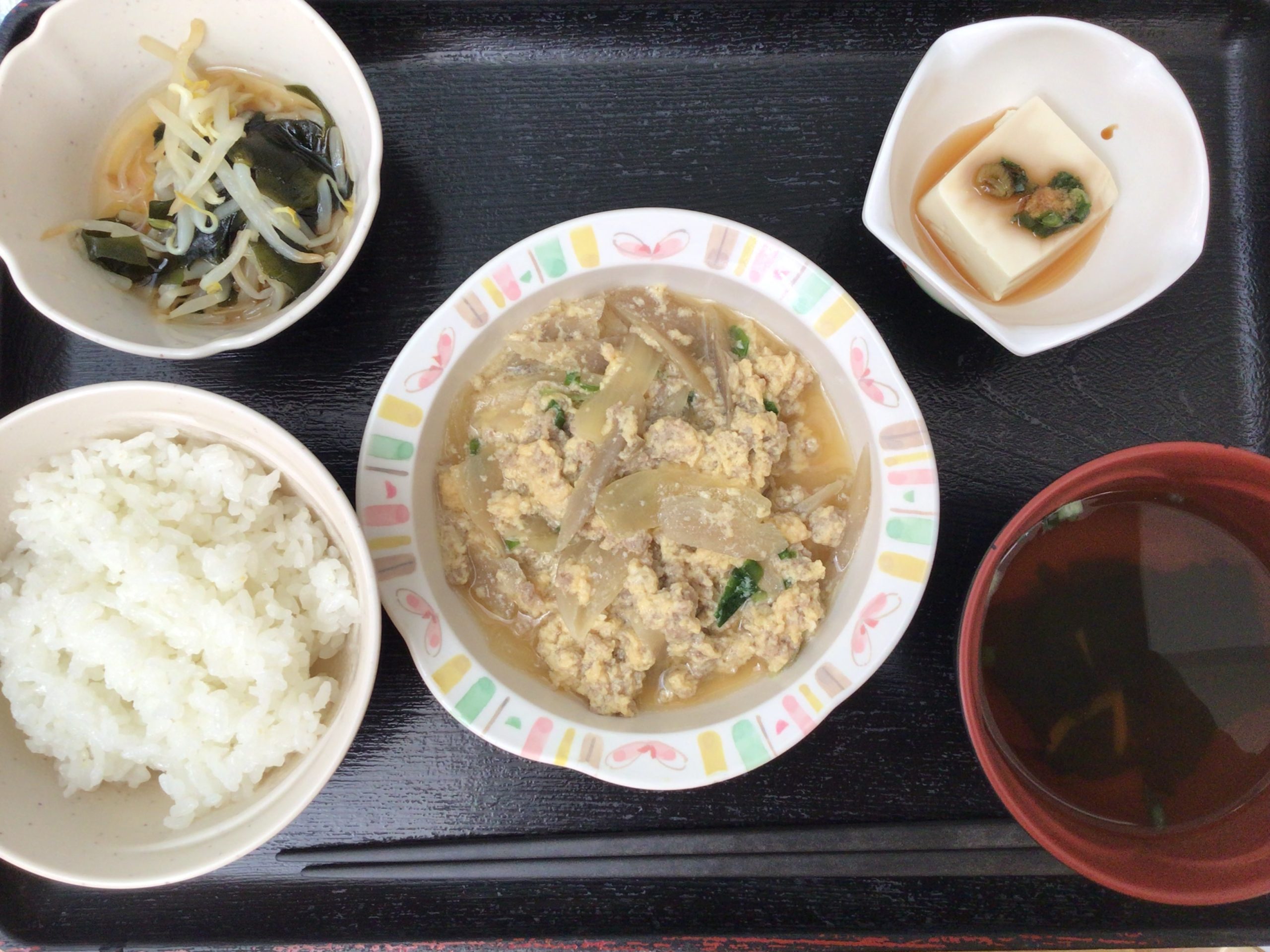 【昼食】 1.米飯 2.豚肉の柳川風 3.もやしゴマ酢醤油 4.奴 5.すまし汁