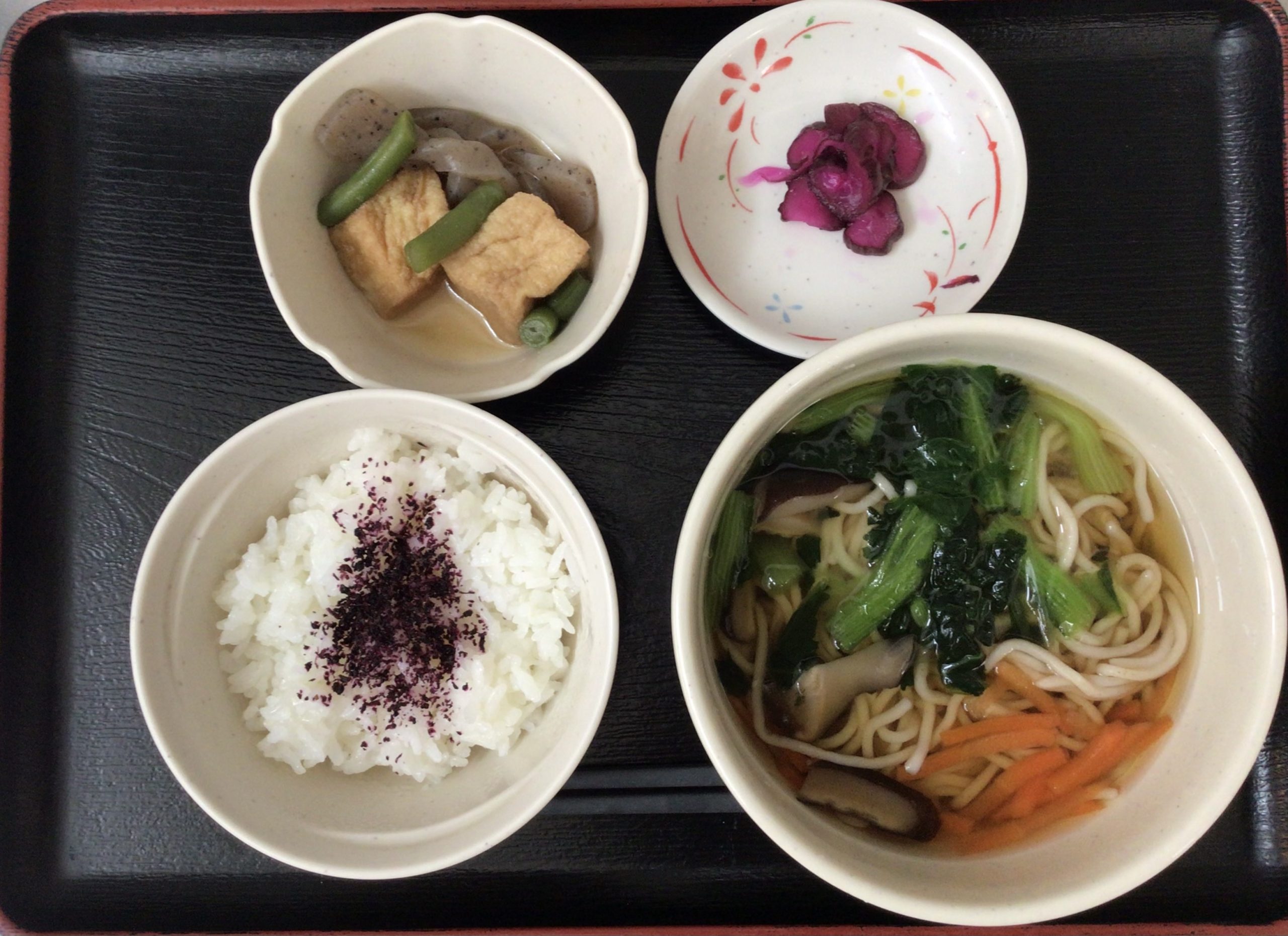 【昼食】 1.ゆかりご飯 2.田舎そば 3.厚揚げとこんにゃく煮 4.漬物