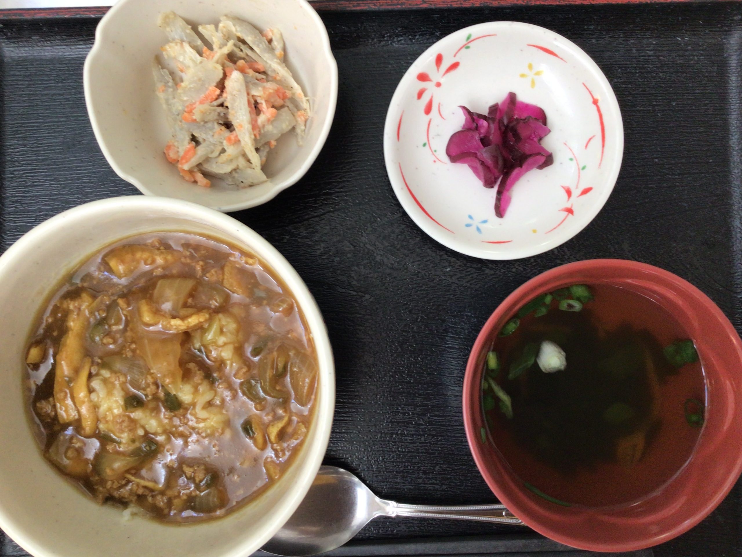 【昼食】 1.カレー丼 2.ごぼうサラダ 3.漬物 4.すまし汁