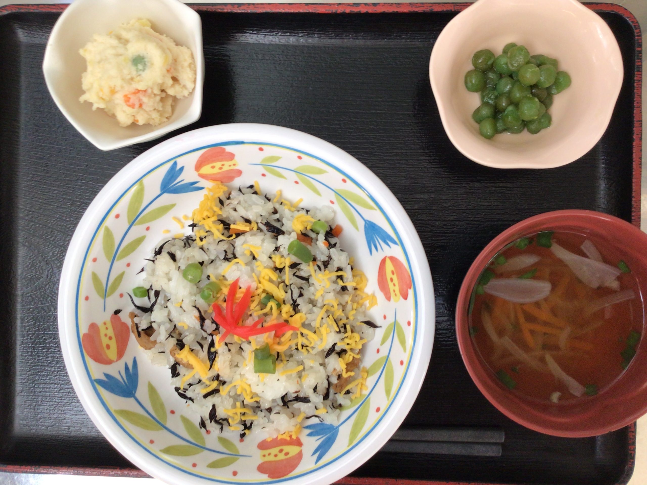 【昼食】 1.ひじきチラシ寿司 2.がんも煮 3.煮豆 4.すまし汁