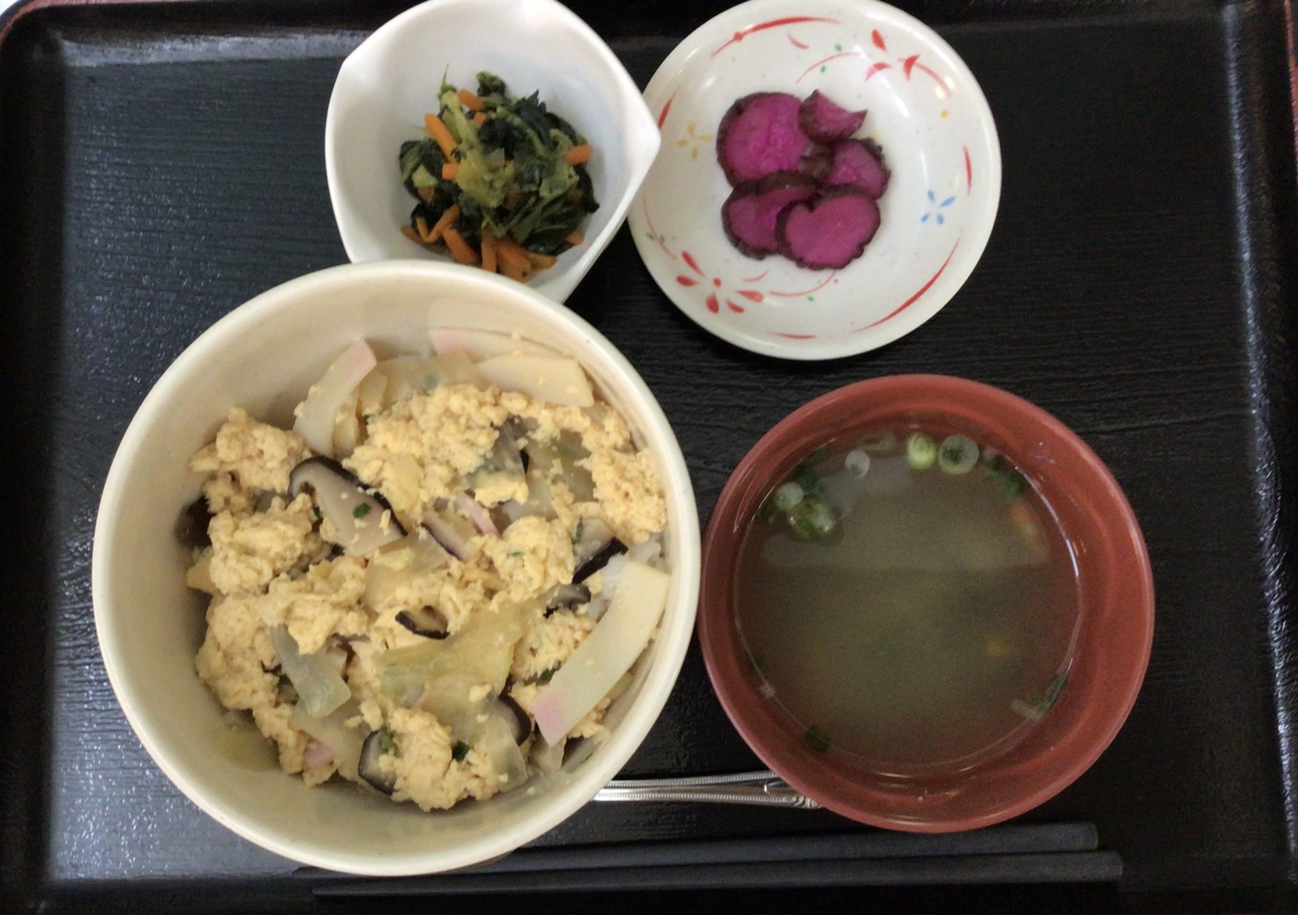 【昼食】 1.木の葉丼 2.青菜お浸し 3.漬物 4.みそ汁