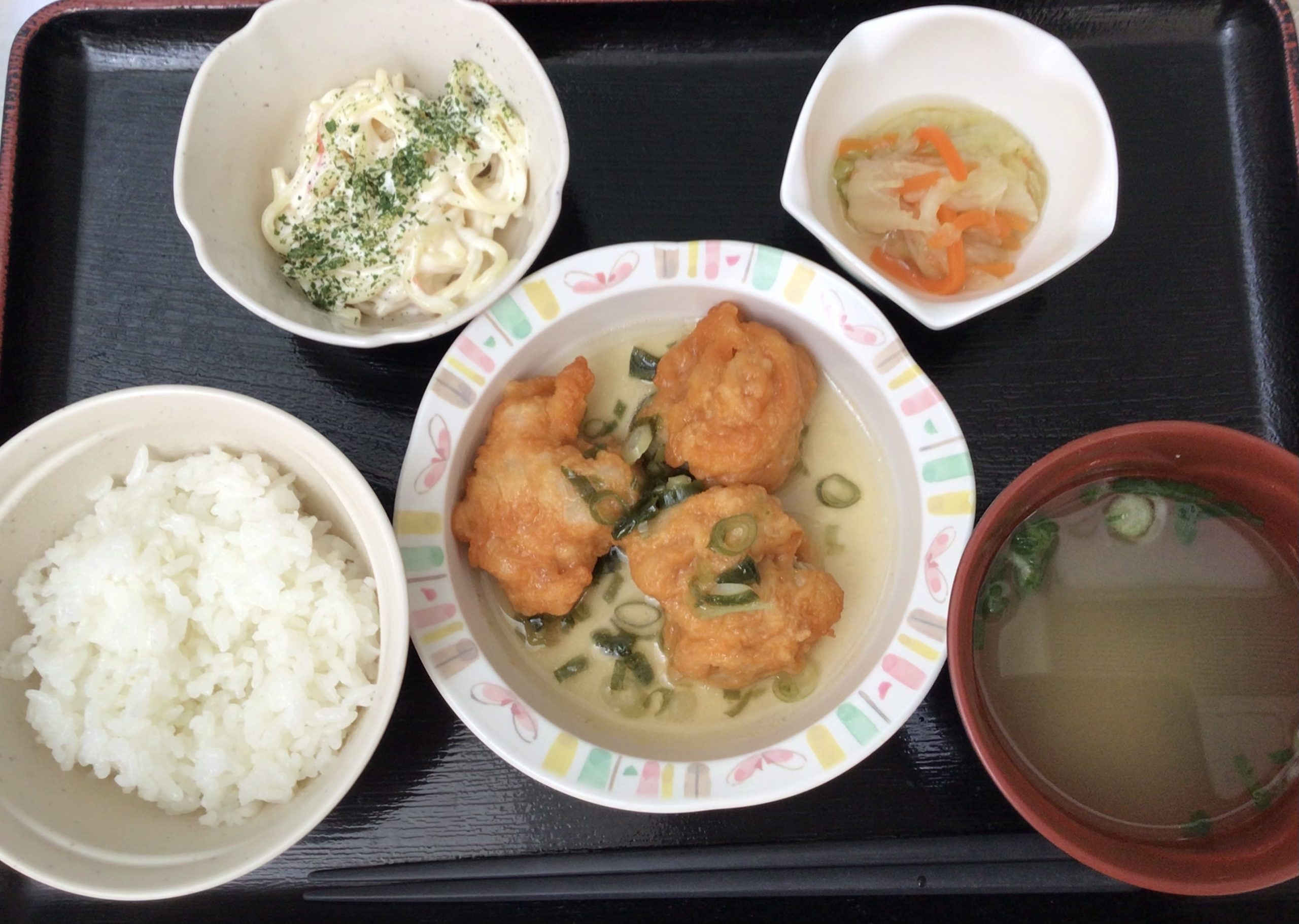 【昼食】 1.米飯 2.鶏唐揚げ和風あん 3.スパゲティサラダ 4.白菜煮 5.みそ汁