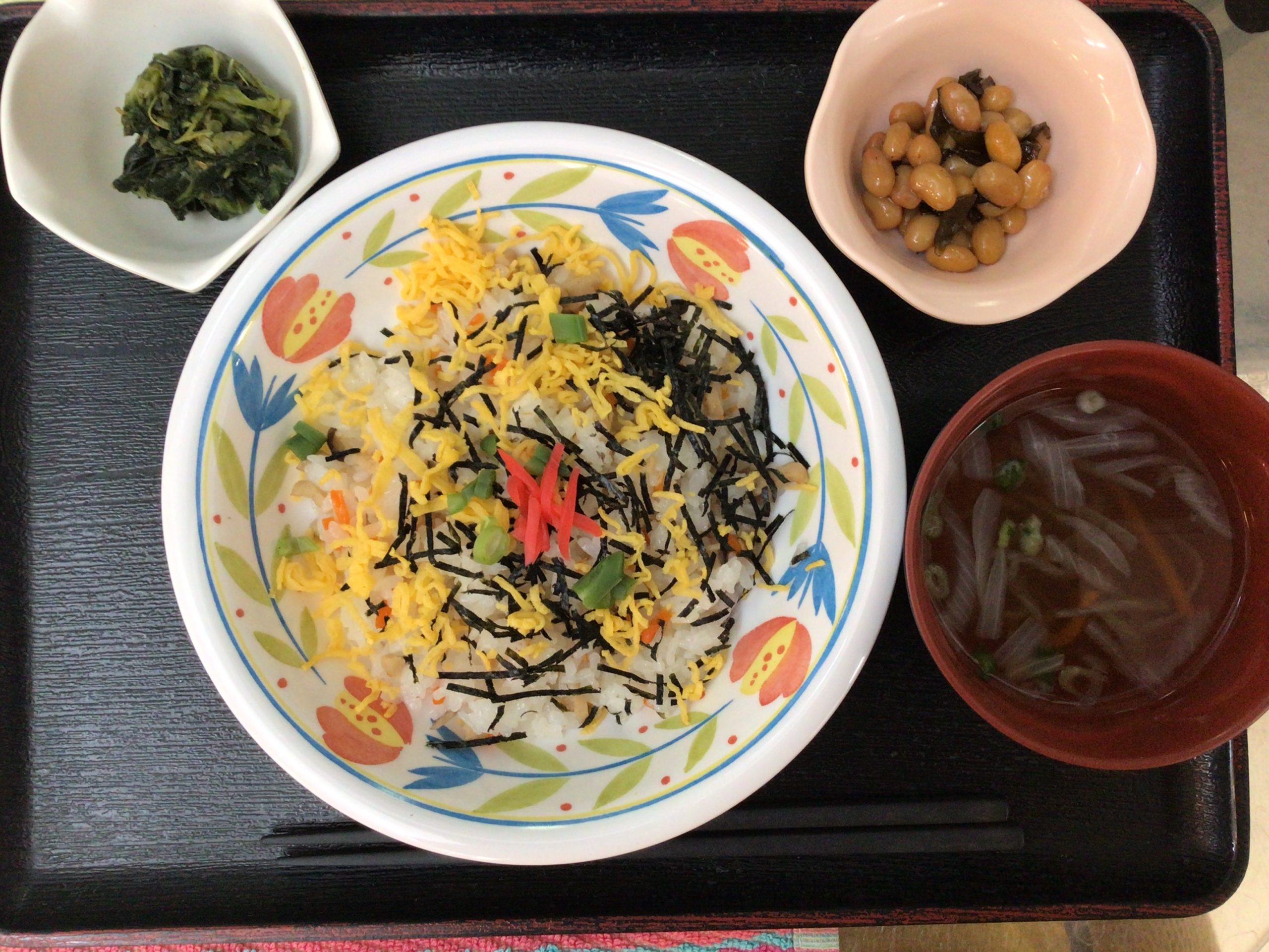 【昼食】 1.五目ちらし寿司 2.青菜のおかか和え 3.野菜豆煮 4.すまし汁