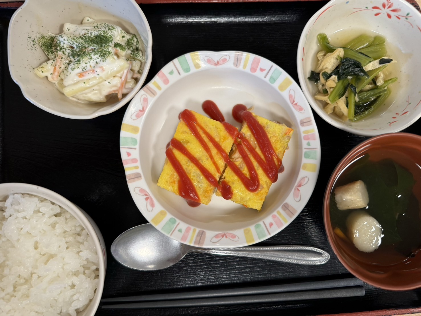 【昼食】 1.ご飯 2.オムレツ 3.マカロニサラダ 4.小松菜の煮浸し 5.すまし汁