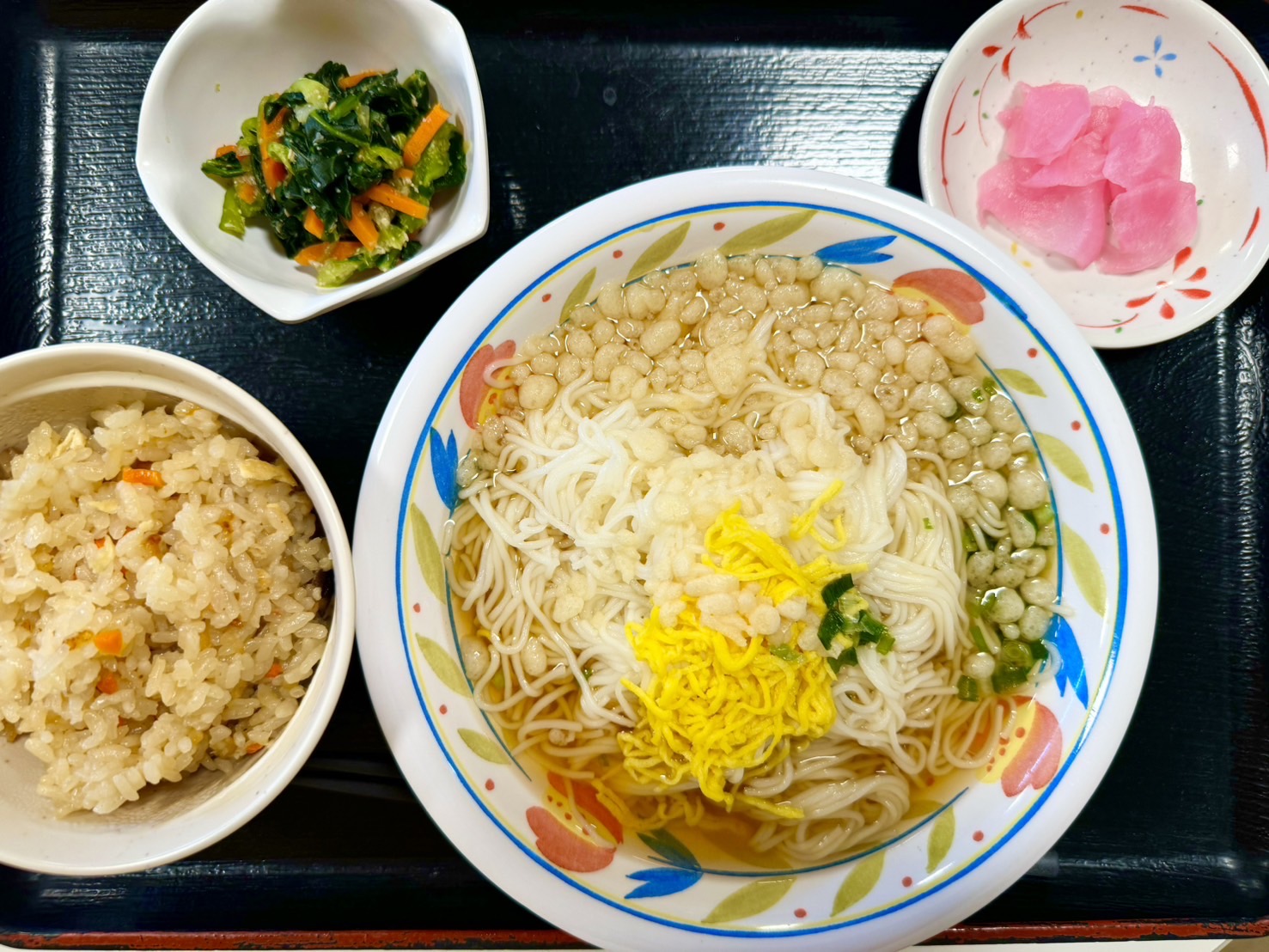 【昼食】 1.かやくご飯(小) 2.ぶっかけそうめん 3.青菜のごま和え 4.漬物