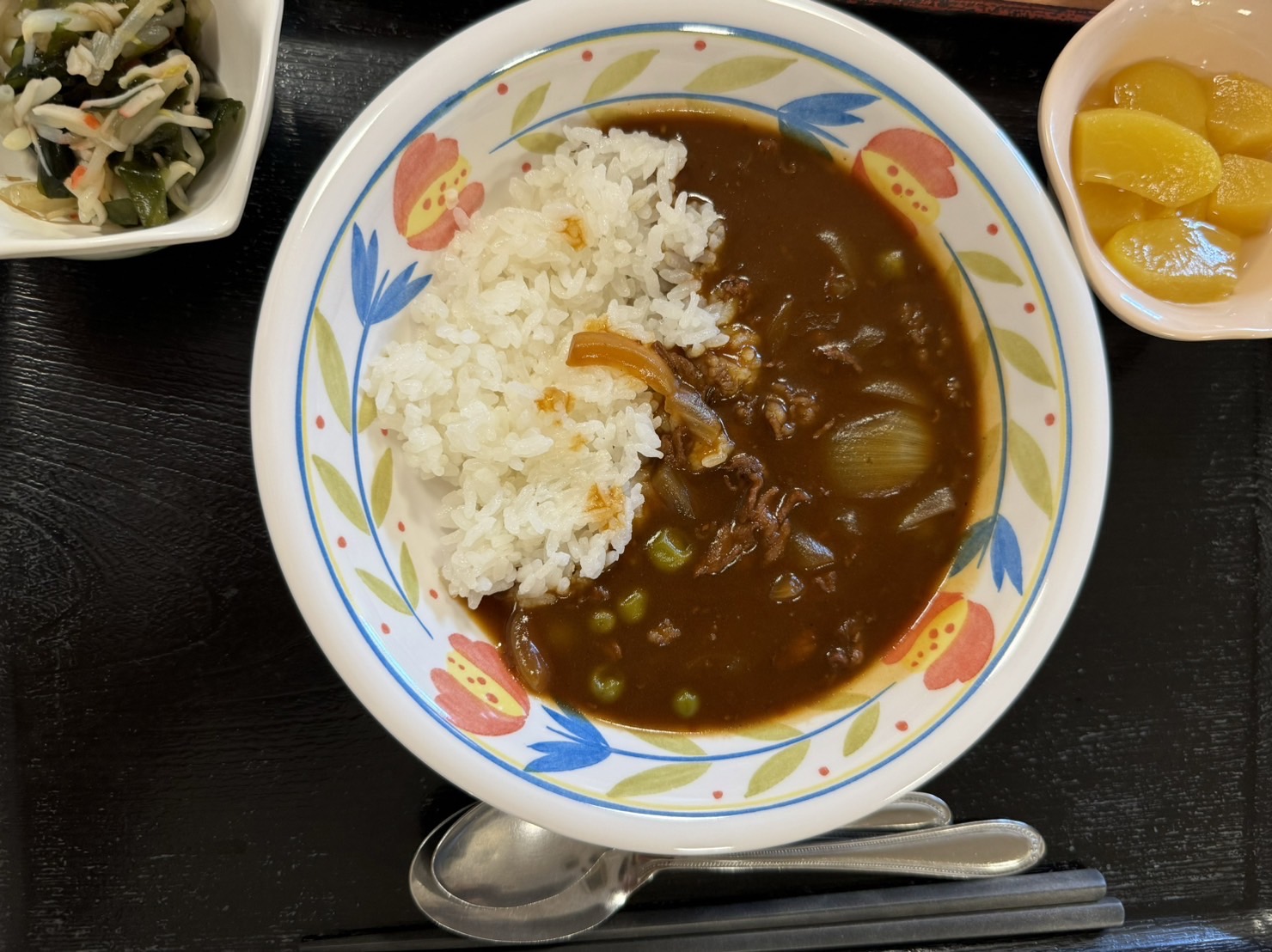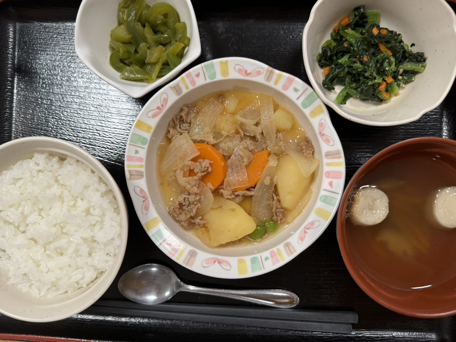 【昼食】 1.ご飯 2.肉じゃが 3.ほうれん草ナムル 4.ピーマン甘辛炒め 5.すまし汁