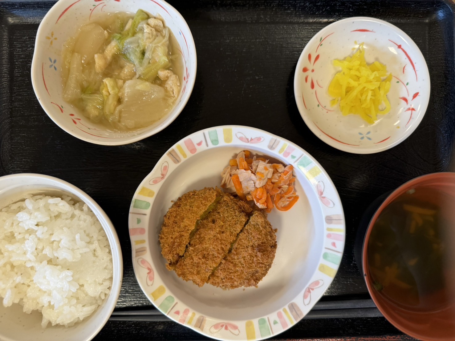 【昼食】 1.ご飯 2.かぼちゃコロッケ 3.にんじんしりしり 4.白菜の煮物 5.漬物 6.すまし汁
