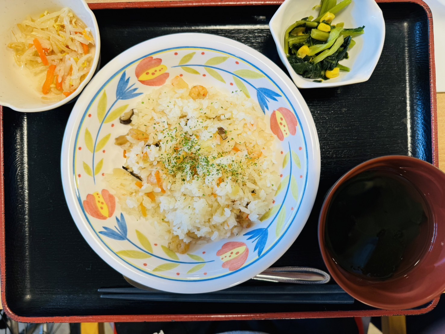【昼食】 1.中華風炊き込みピラフ 2.青菜炒め 3.もやしの胡麻酢和え 4.すまし汁