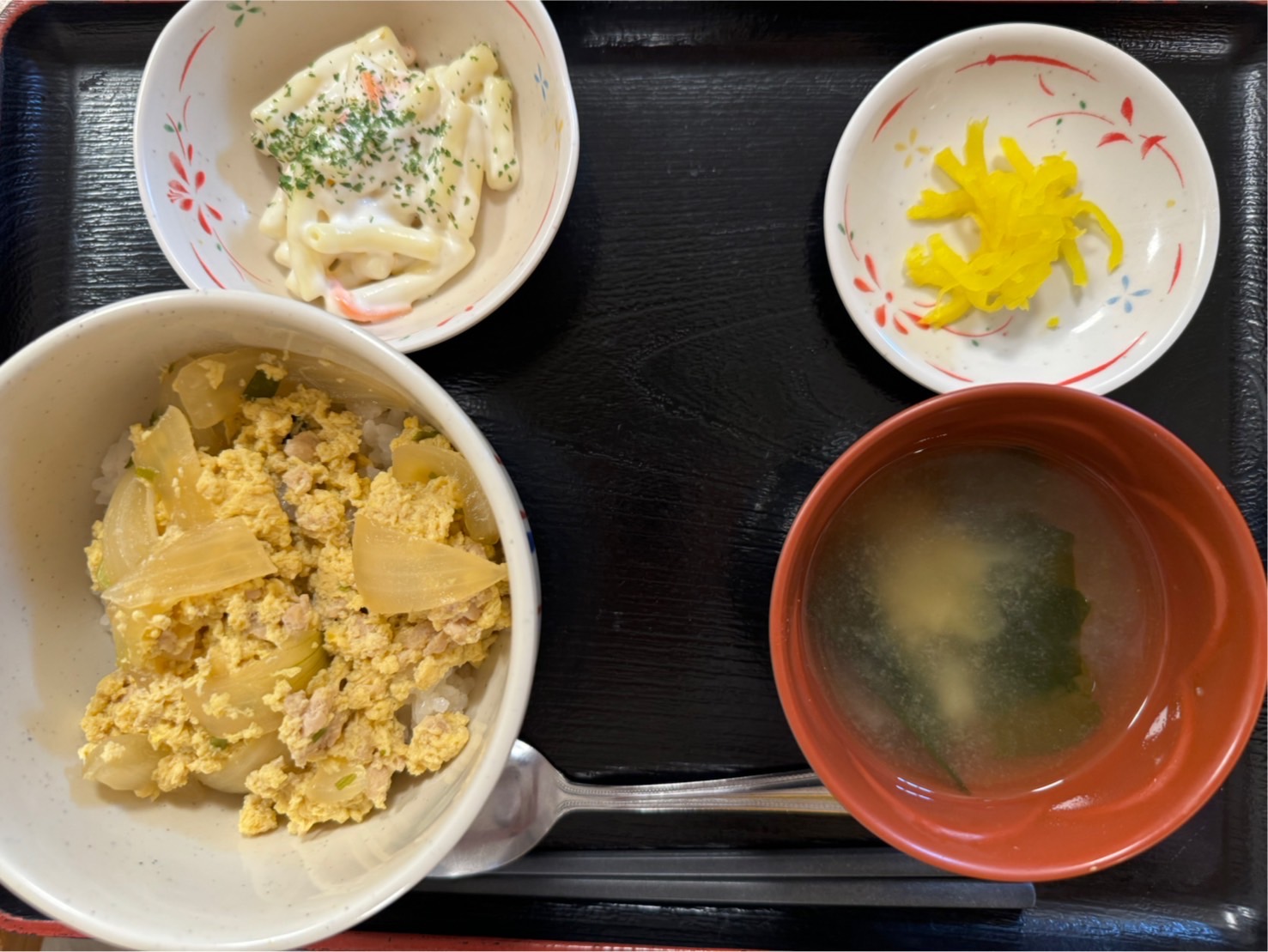 【昼食】 1.親子丼 2.マカロニサラダ 3.漬物 4.みそ汁