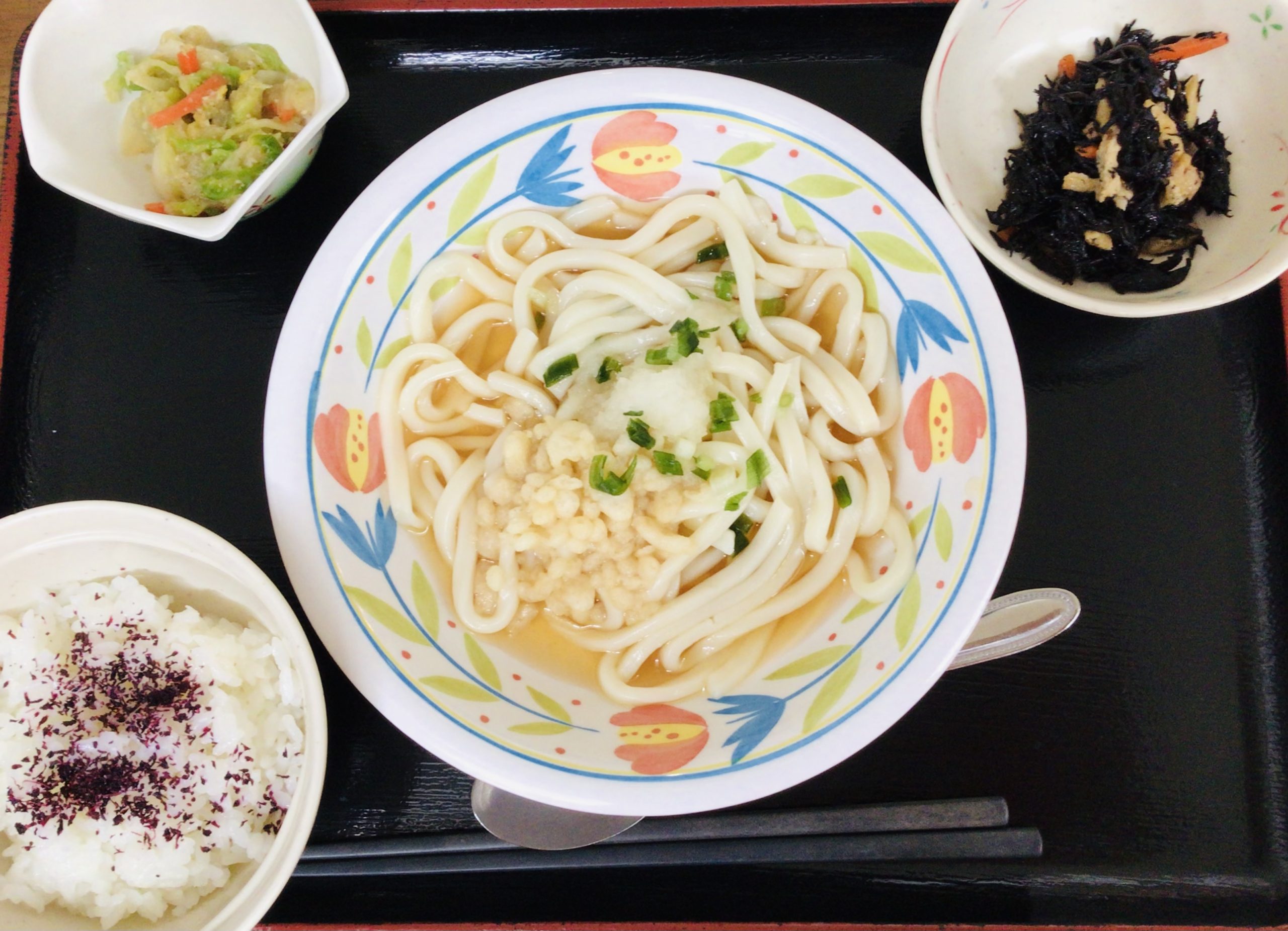 【昼食】 1.ゆかりご飯(小) 2.ぶっかけおろしうどん 3.白菜のごま和え 4.ひじき煮