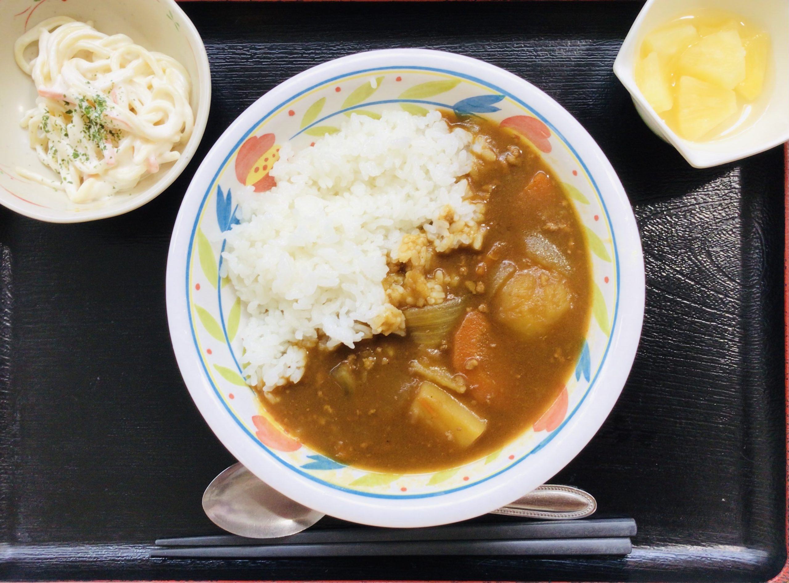 【昼食】 1.カレーライス 2.スパゲティサラダ 3.フルーツ缶