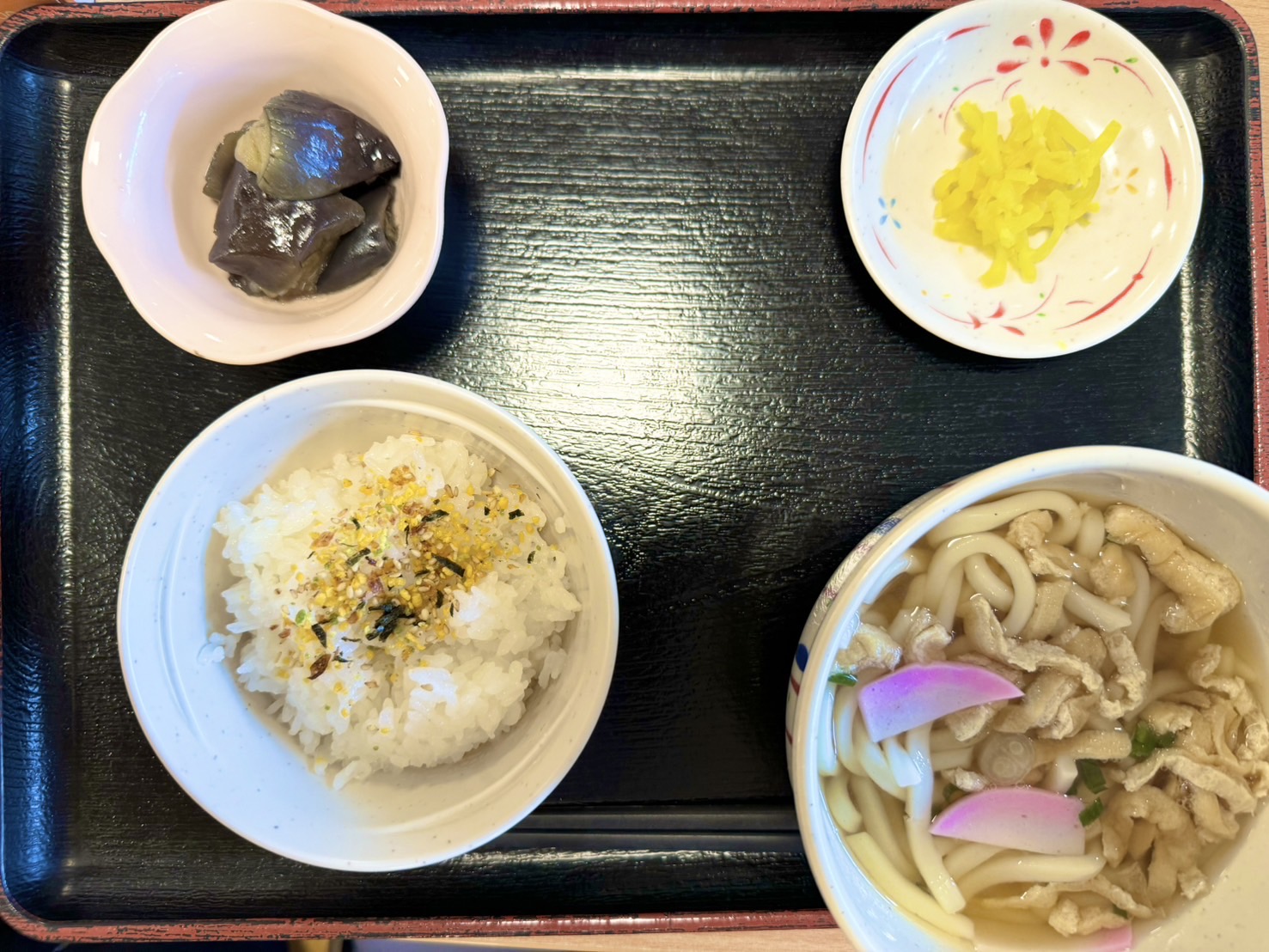 【昼食】 1.ふりかけご飯(小) 2.きつねうどん 3.揚げ茄子ポン酢和え 4.漬物