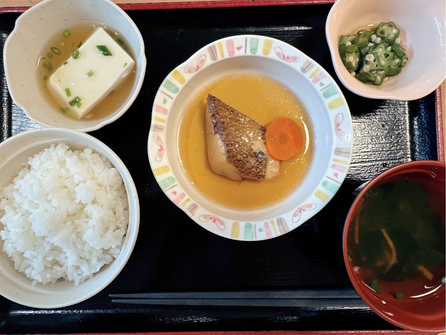 【昼食】 1.ご飯 2.かれいの煮つけ 3.豆腐のあんあけ 4.オクラのポン酢和え 5.すまし汁