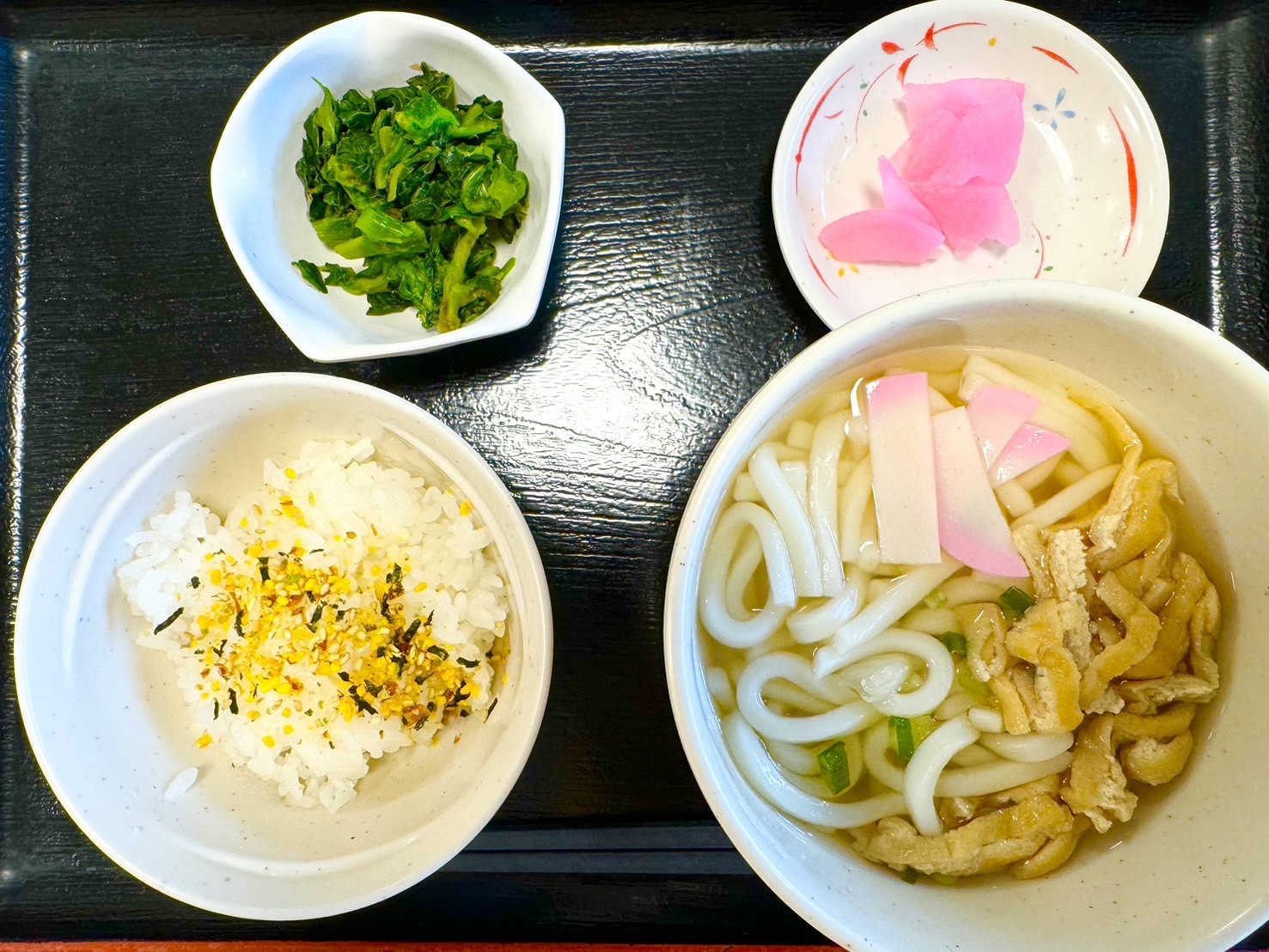 【昼食】 1.ふりかけご飯(小) 2.きざみうどん 3.菜の花のおかか和え 4.漬物