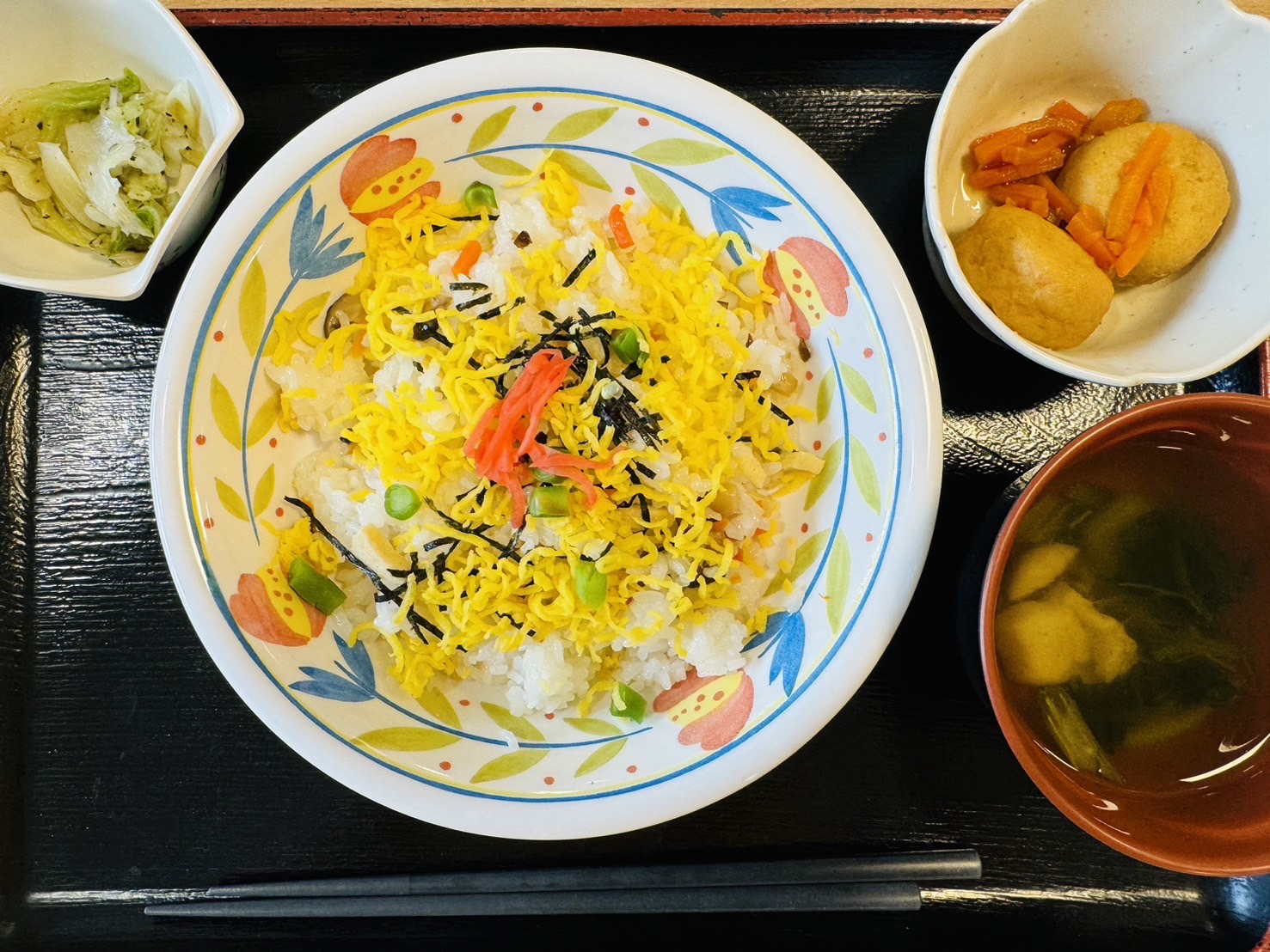 【昼食】 1.五目ちらし寿司 2.がんも煮 3.白菜ゆかり和え 4.すまし汁