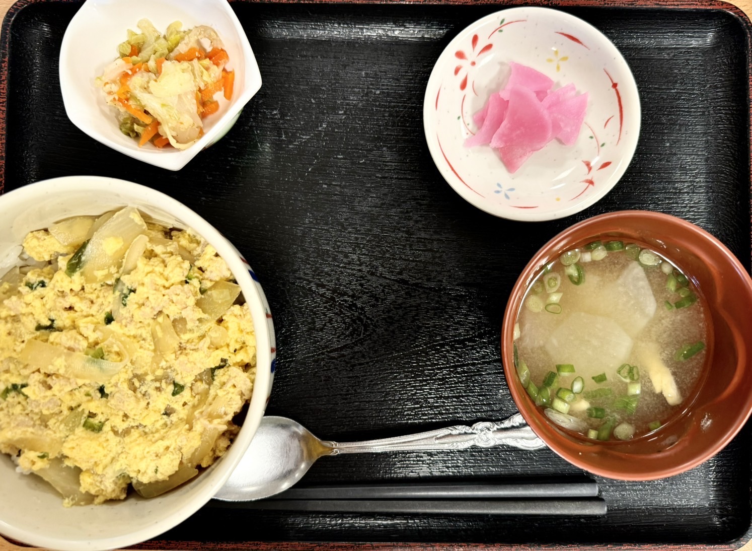 【昼食】 1.親子丼 2.白菜の胡麻酢和え 3.漬物 4.みそ汁