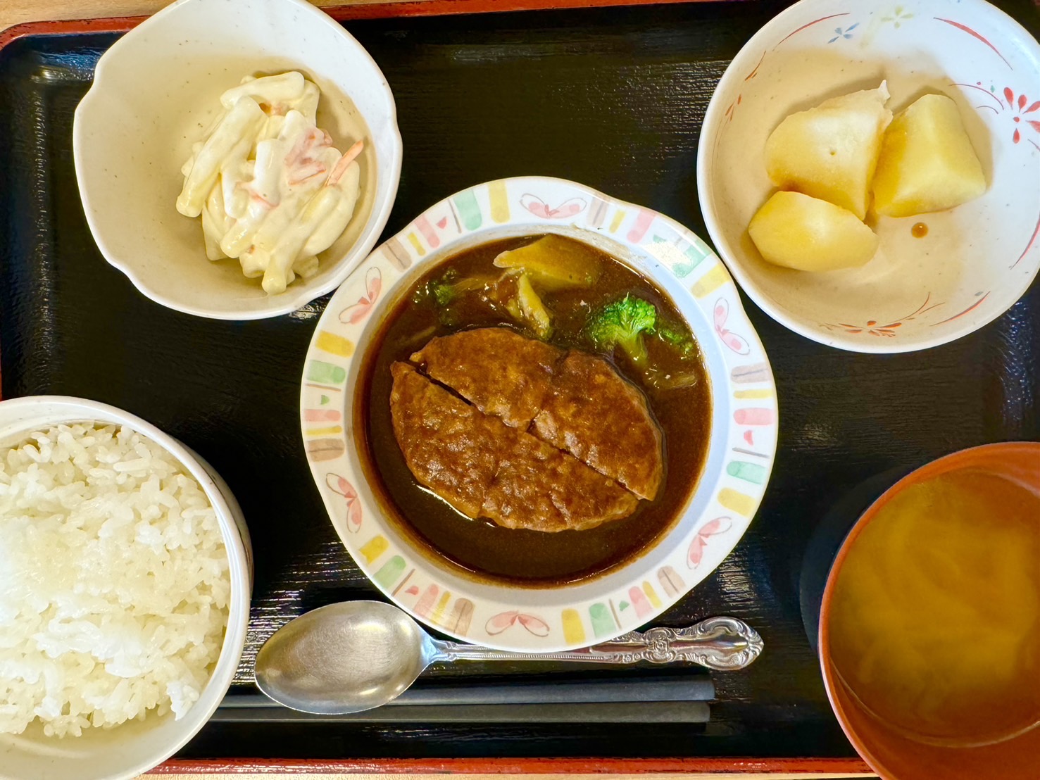 【昼食】 1.ご飯 2.煮込みハンバーグ 3.マカロニサラダ 4.粉ふきいも 5.コンソメスープ