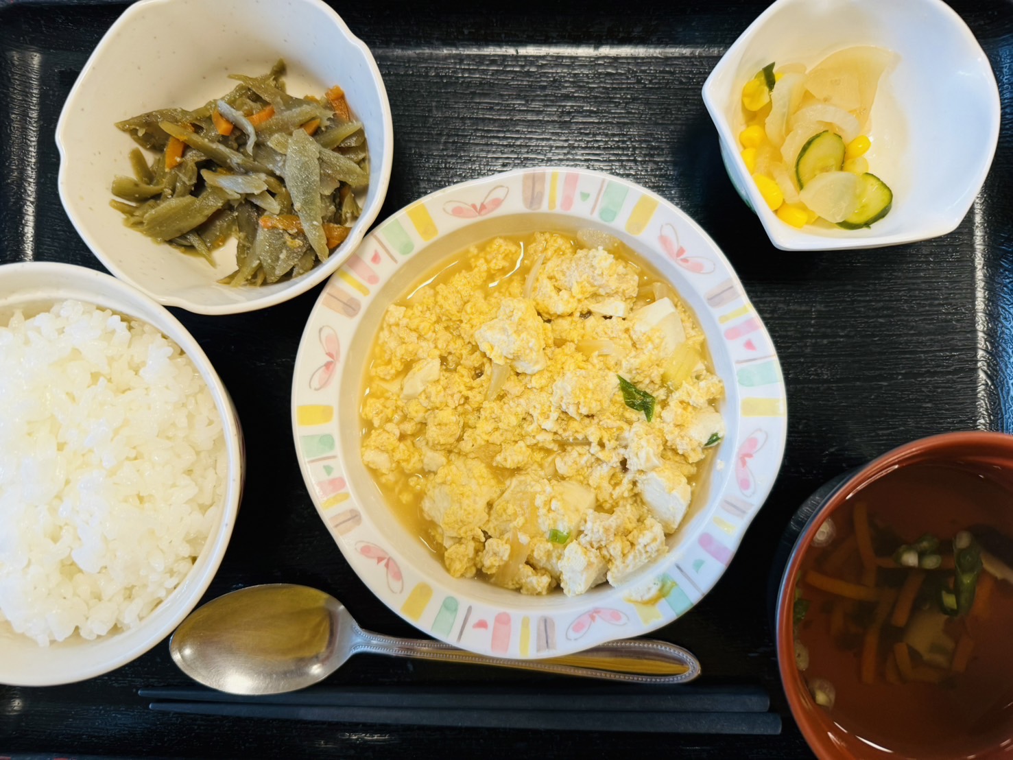 【昼食】 1.ご飯 2.甘辛豆腐の卵とじ 3.きんぴらごぼう 4.大根サラダ 5.すまし汁