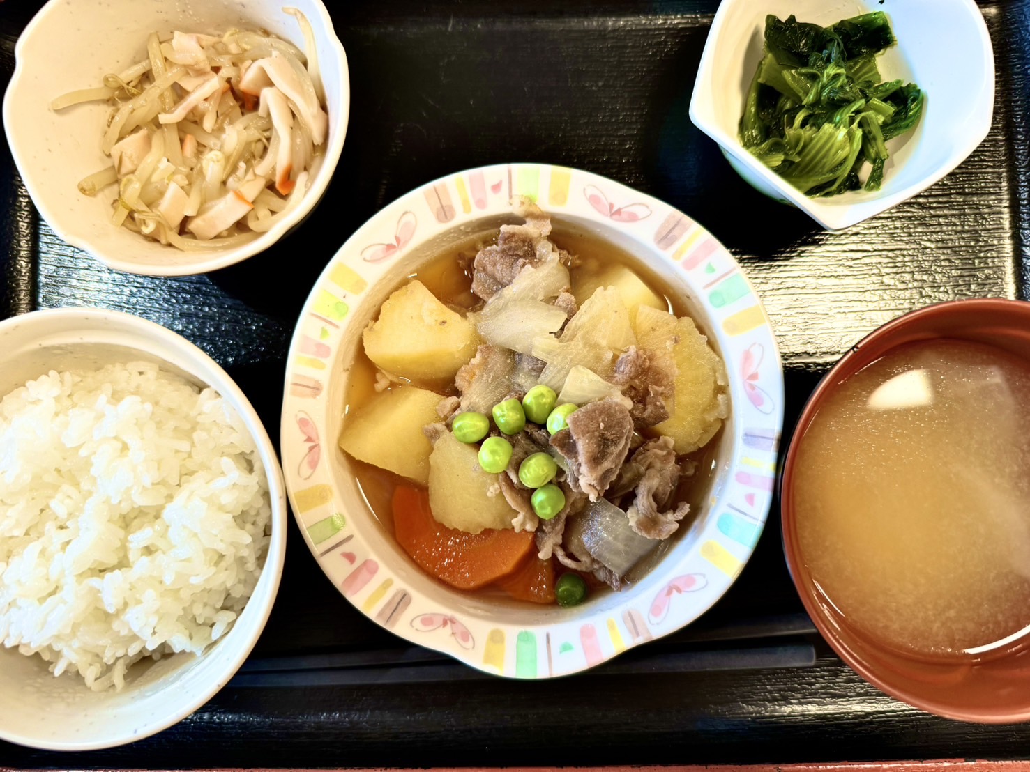 【昼食】 1.ご飯 2.肉じゃが 3.もやしとハムのソテー 4.ほうれん草のおひたし 5.みそ汁
