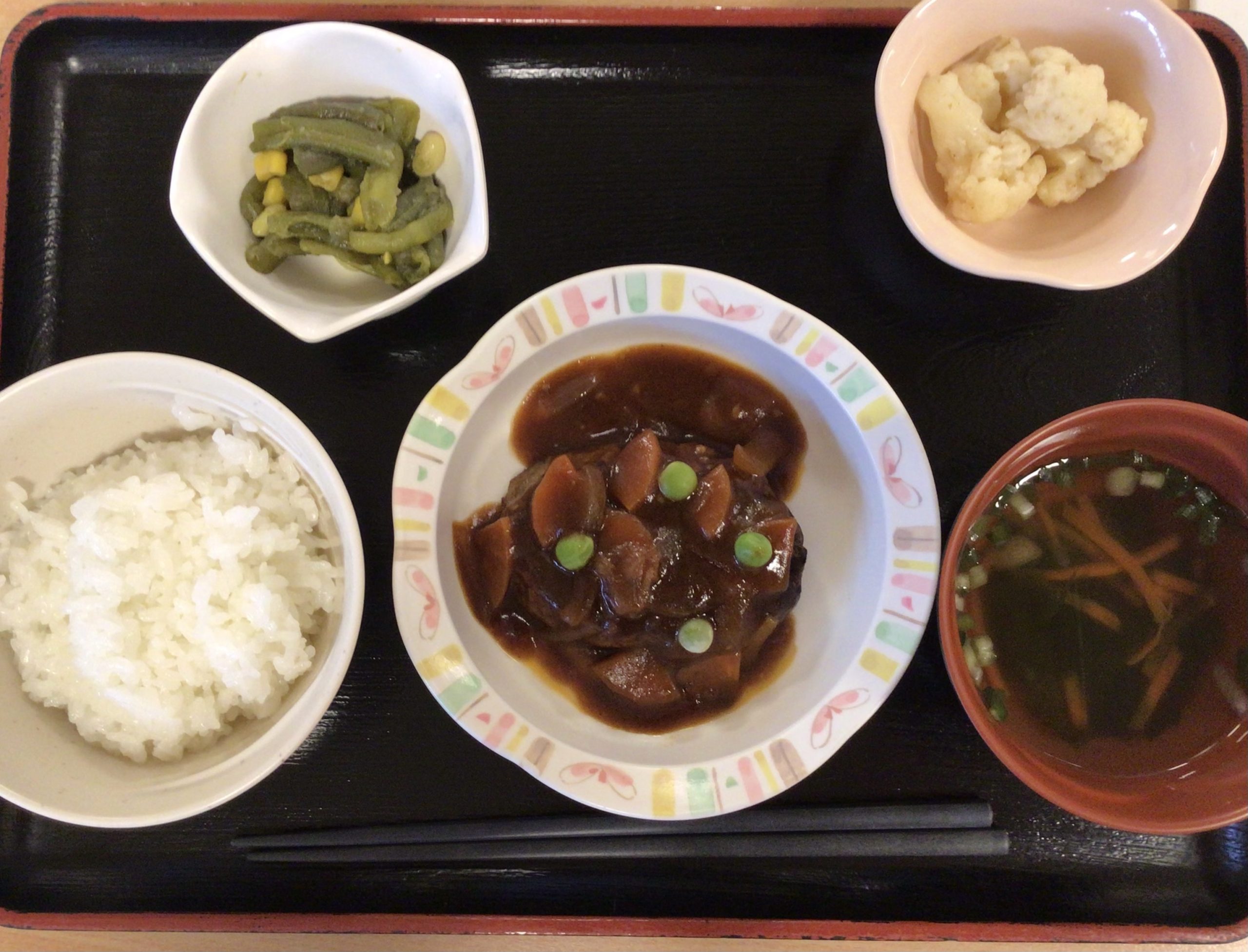 【昼食】 1.ご飯 2.煮込みハンバーグ 3.いんげんバター炒め 4.カリフラワーサラダ 5.すまし汁