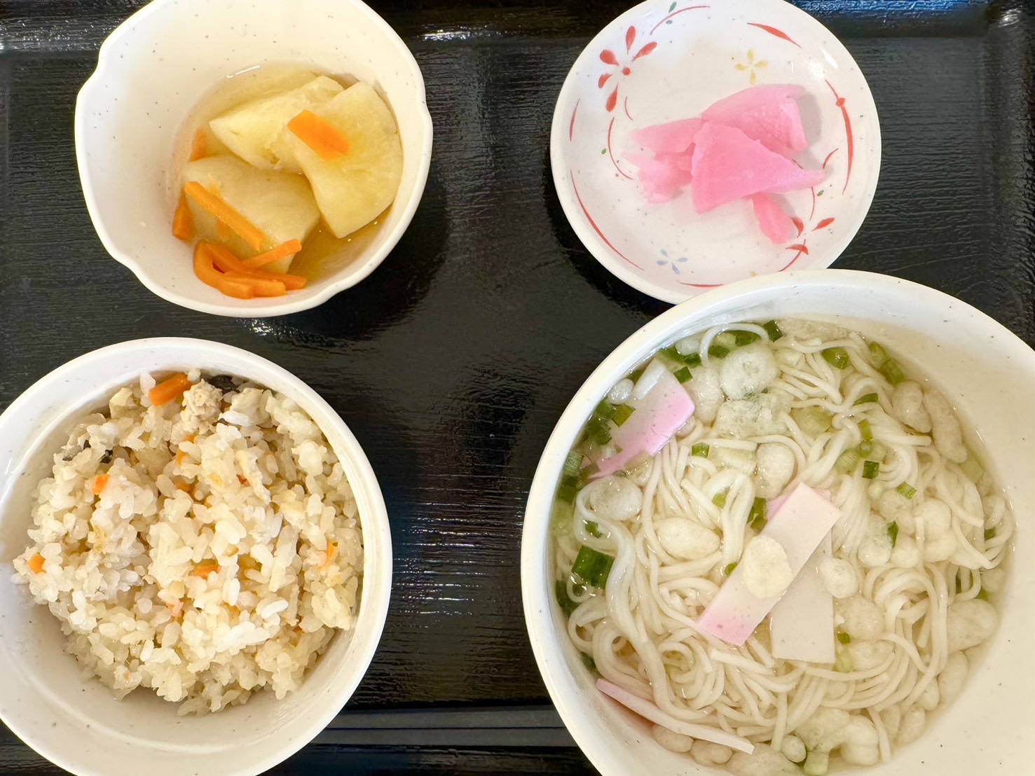 【昼食】 1.かやくご飯(小) 2.にゅう麺 3.白和え 4.漬物