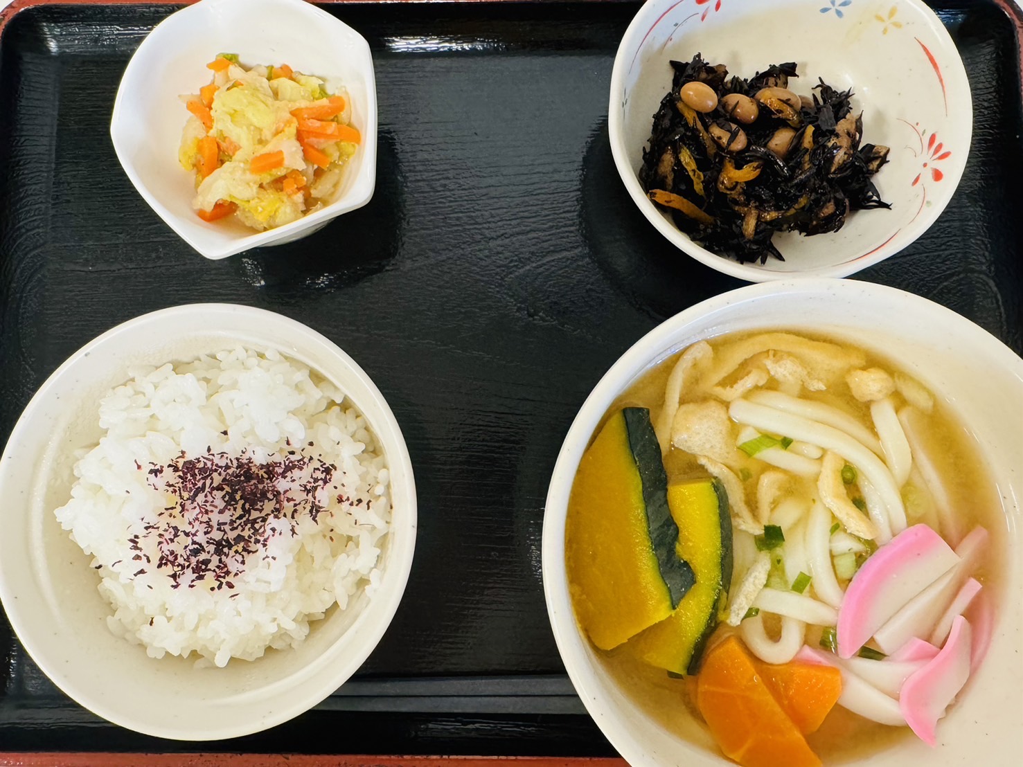 【昼食】 1.ゆかりご飯(小) 2.ほうとう風うどん 3.白菜のごま和え 4.ひじき煮