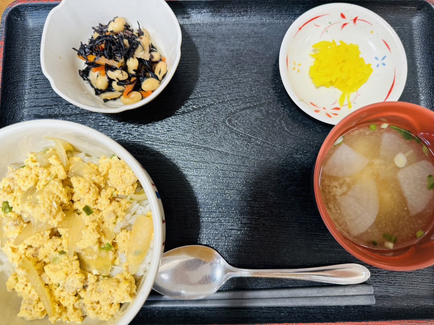 【昼食】 1.親子丼 2.ひじきと豆の煮物 3.漬物 4.みそ汁
