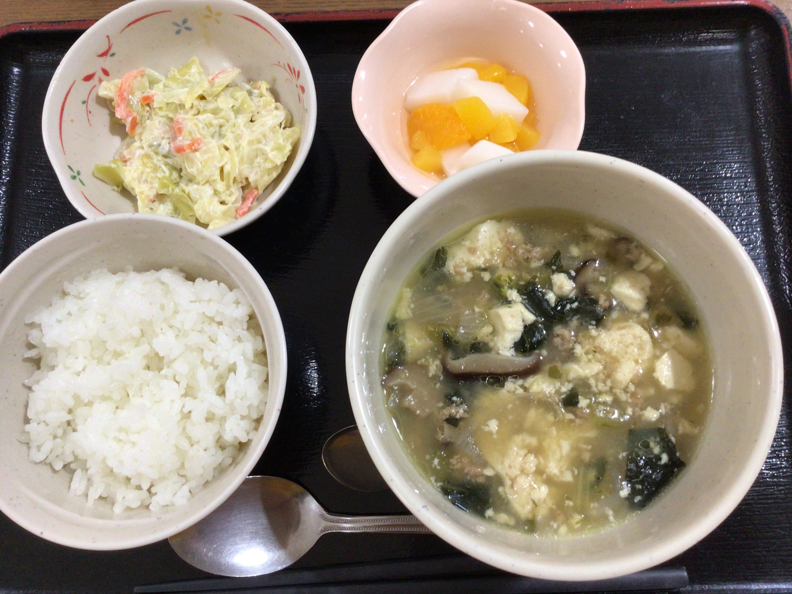 【昼食】 1.ご飯 2.中華スープ煮 3.キャベツ辛子マヨ和え 4.フルーツ杏仁豆腐