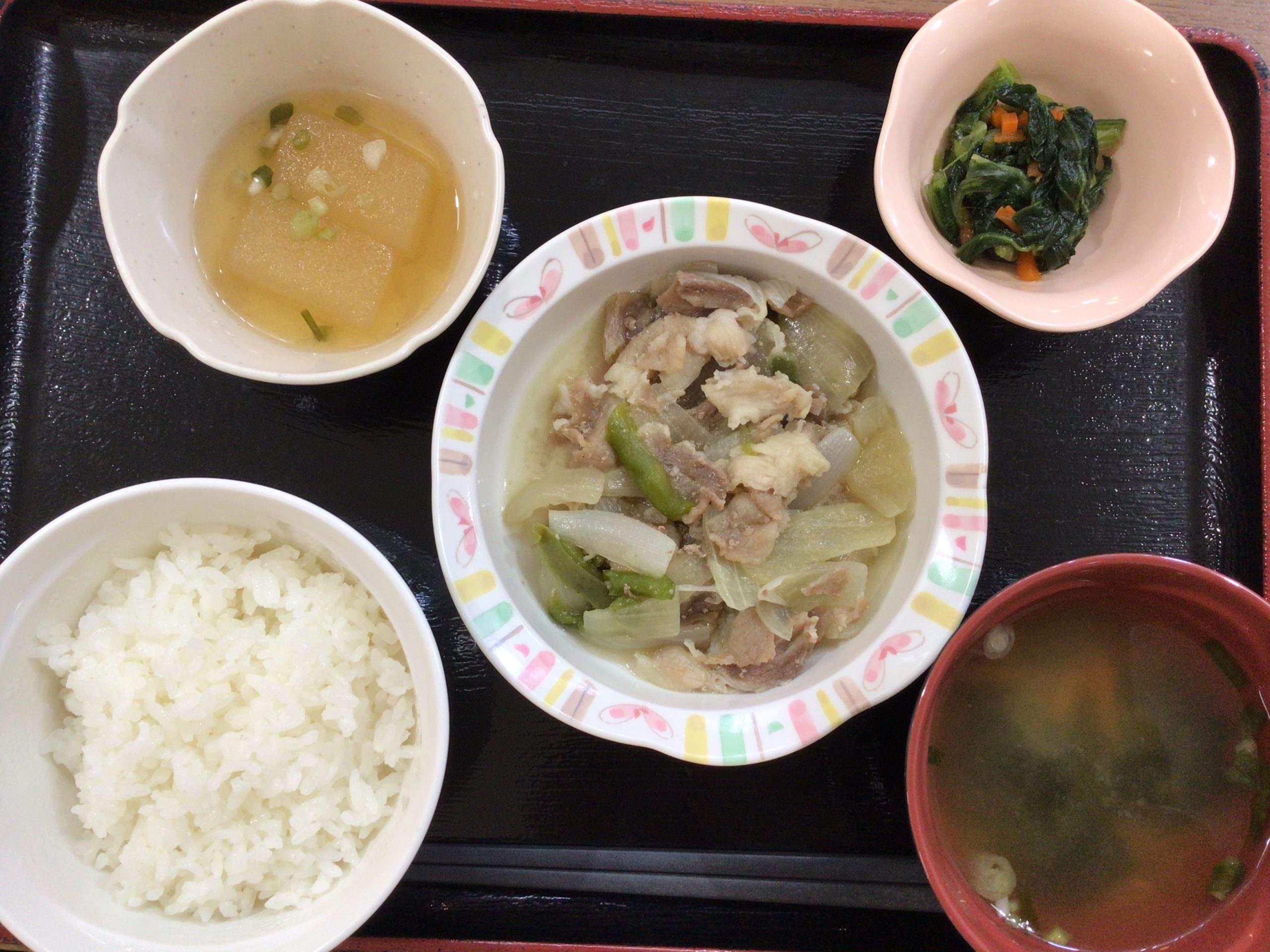 【昼食】 1.ご飯 2.豚肉の塩だれ焼き 3.冬瓜の煮物 4.小松菜の和え物 5.みそ汁