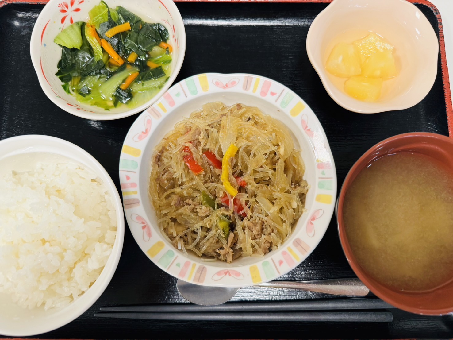 【昼食】 1.ご飯 2.チャプチェ 3.青梗菜のスープ煮 4.フルーツ缶 5.みそ汁