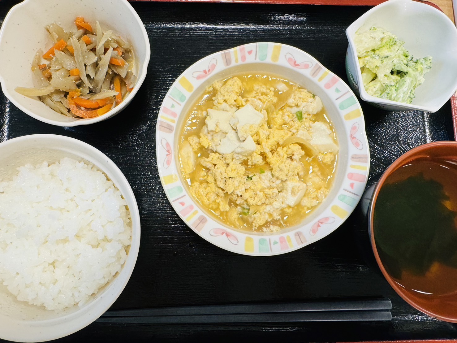 【昼食】 1.ご飯 2.甘辛豆腐の卵とじ 3.きんぴらごぼう 4.ブロッコリーマヨ和え 5.すまし汁