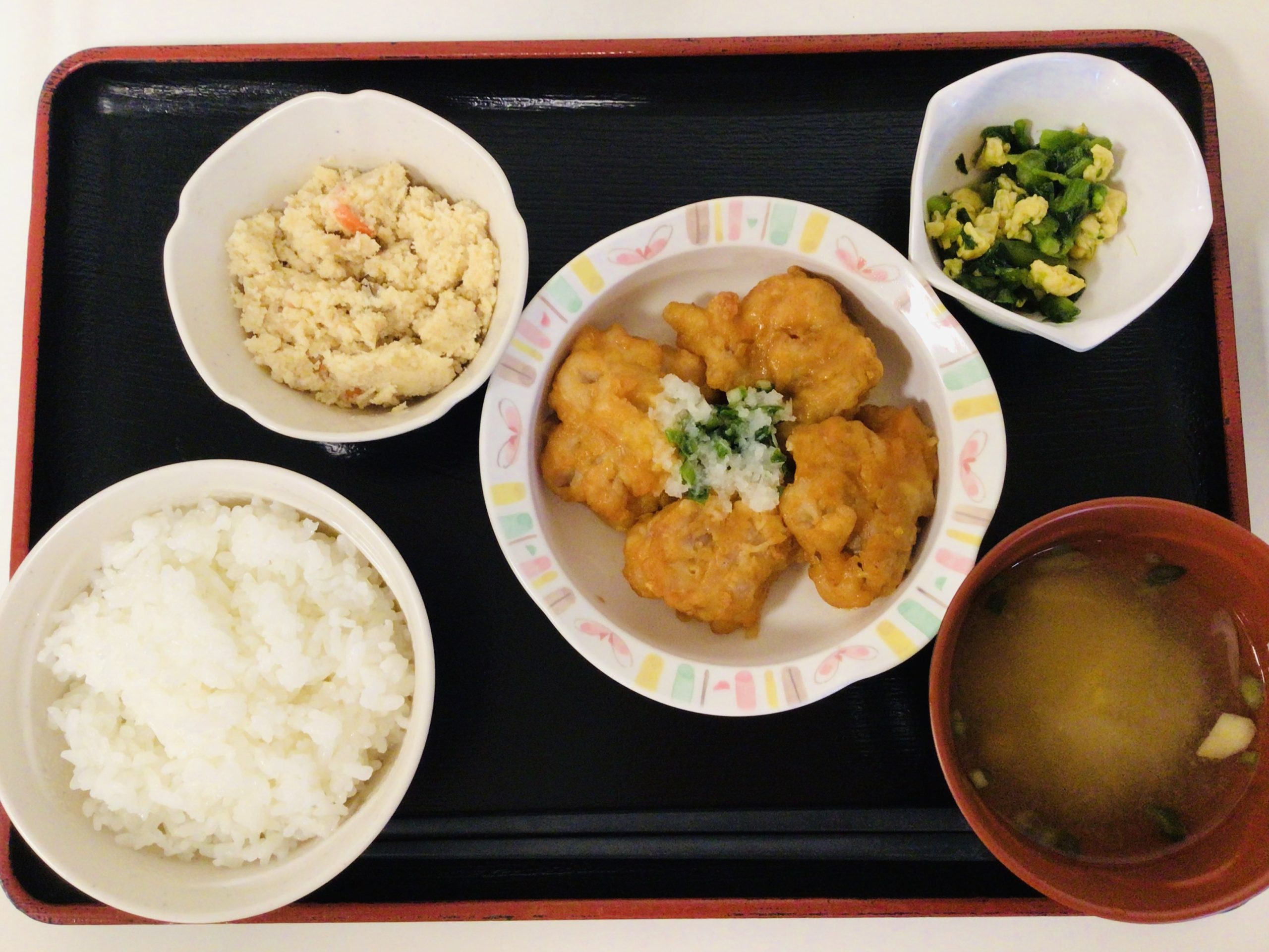 【昼食】 1.ご飯 2.鶏の揚げおろしかけ 3.卯の花 4.菜の花のなたね和え 5.みそ汁