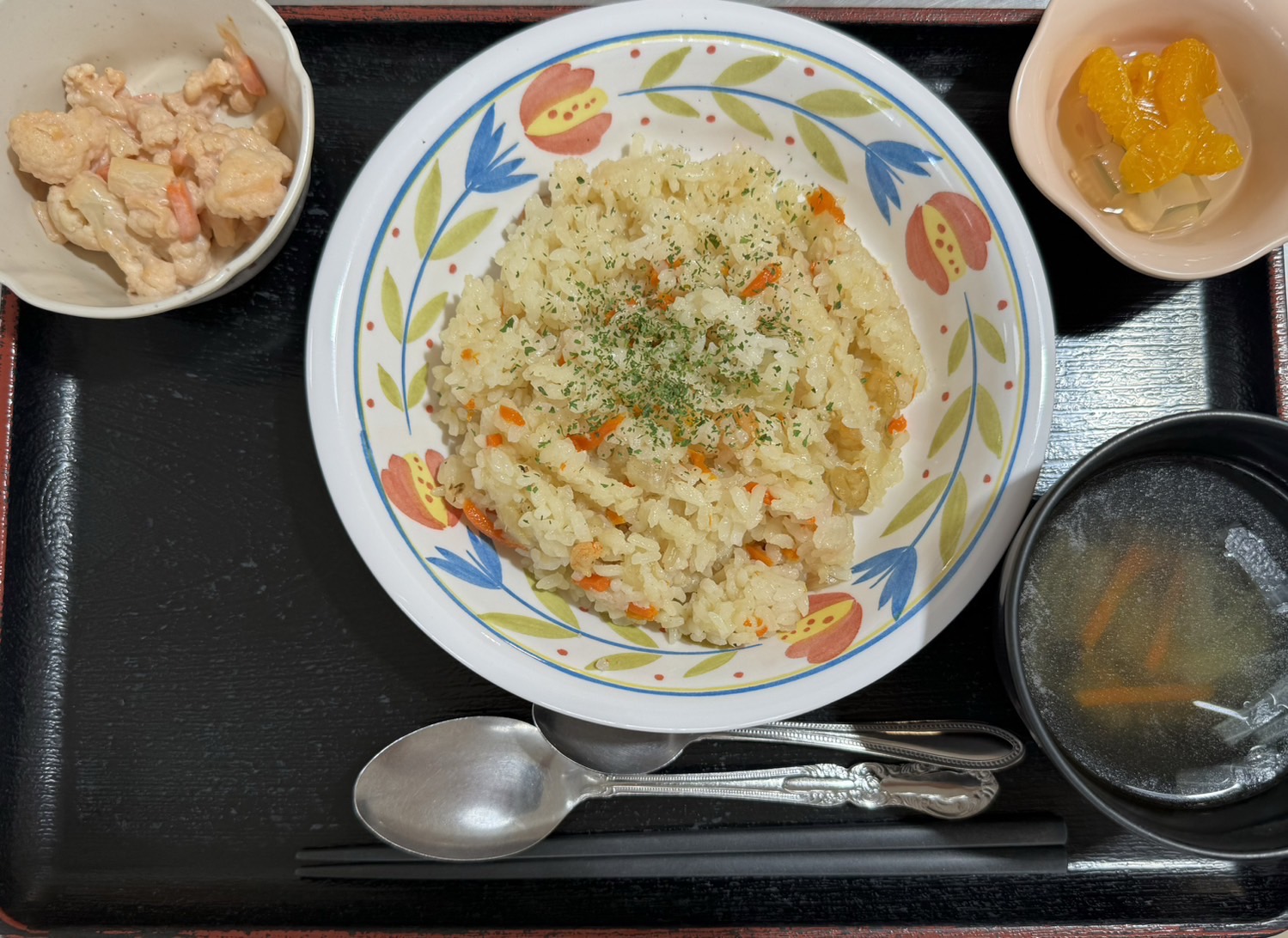 【昼食】 1.炊き込みエビピラフ 2.オーロラサラダ 3.フルーツ寒天 4.コンソメスープ