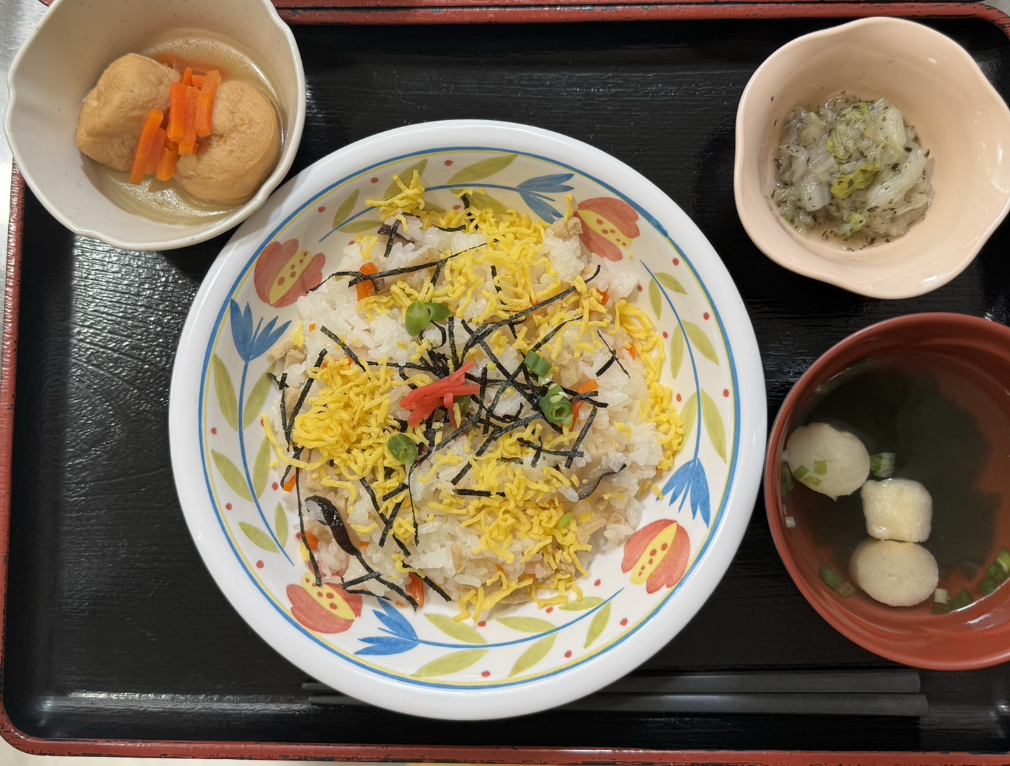 【昼食】 1.五目ちらし寿司 2.がんもの含め煮 3.白菜ゆかり和え 4.すまし汁