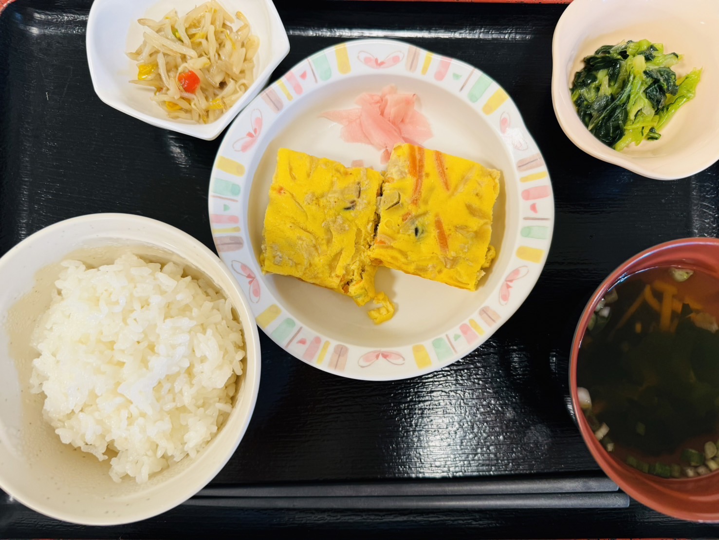 【昼食】 1.ご飯 2.千草焼き 3.もやしの炒め物 4.小松菜のおひたし 5.すまし汁