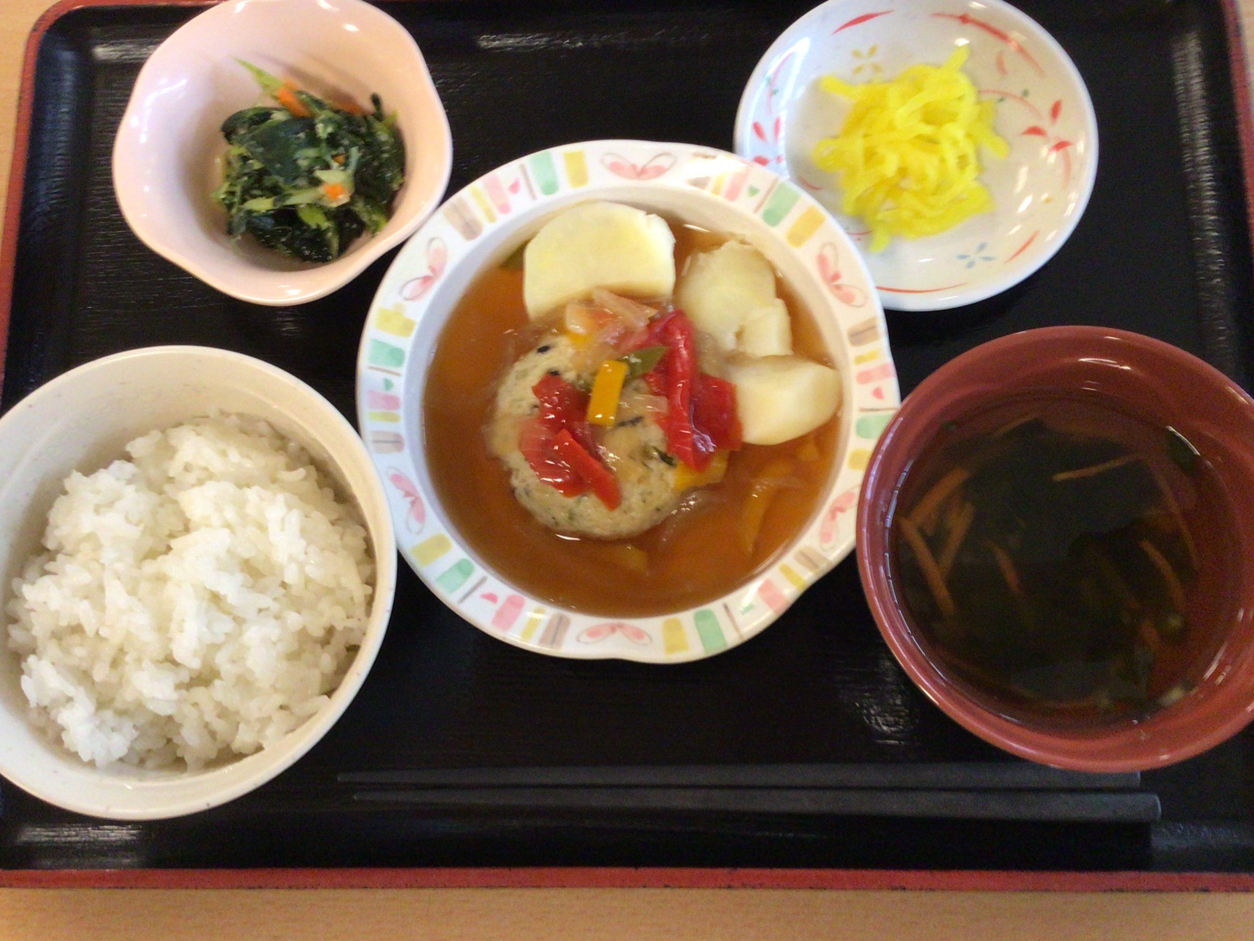 【昼食】 1.ご飯 2.豆腐ハンバーグ甘辛ソース 3.粉ふきいも 4.小松菜胡麻和え 5.漬物 6.すまし汁