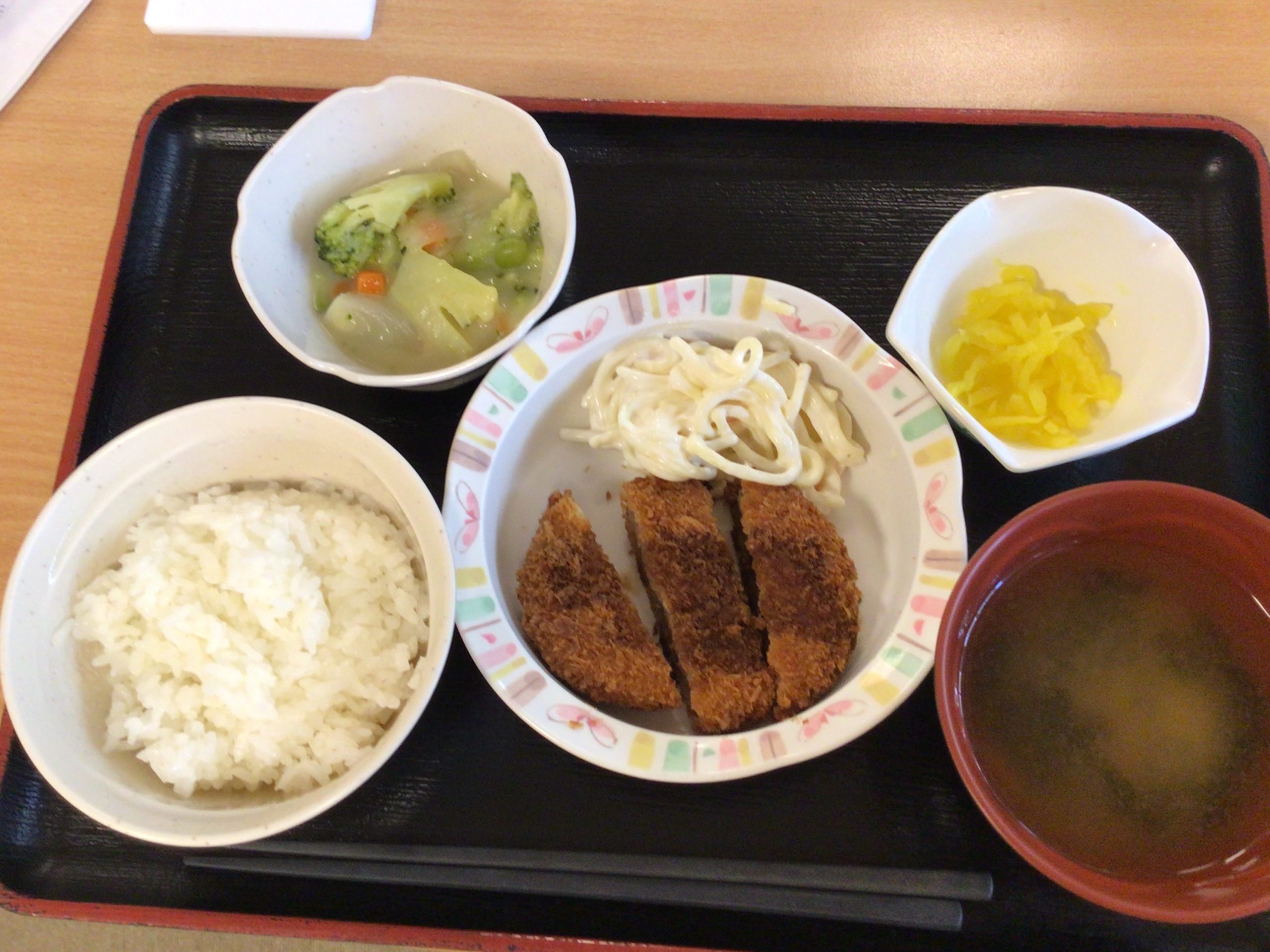 【昼食】 1.ご飯 2.メンチカツ 3.スパゲティサラダ 4.ブロッコリーのクリーム煮 5.漬物 6.みそ汁