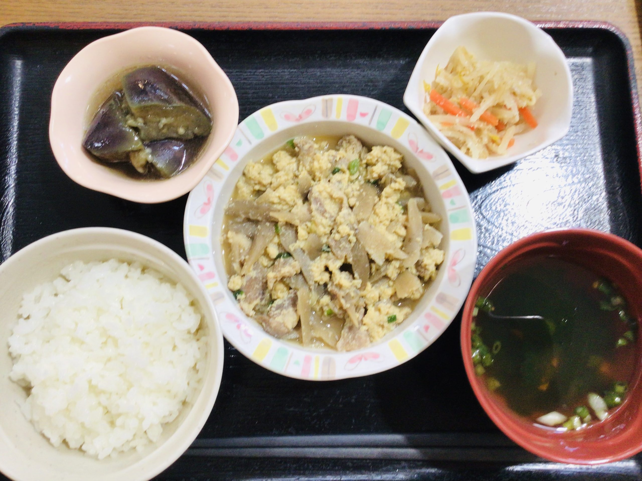 【昼食】 1.ご飯 2.豚肉の柳川風 3.茄子の生姜煮 4.もやしの胡麻酢和え 5.すまし汁