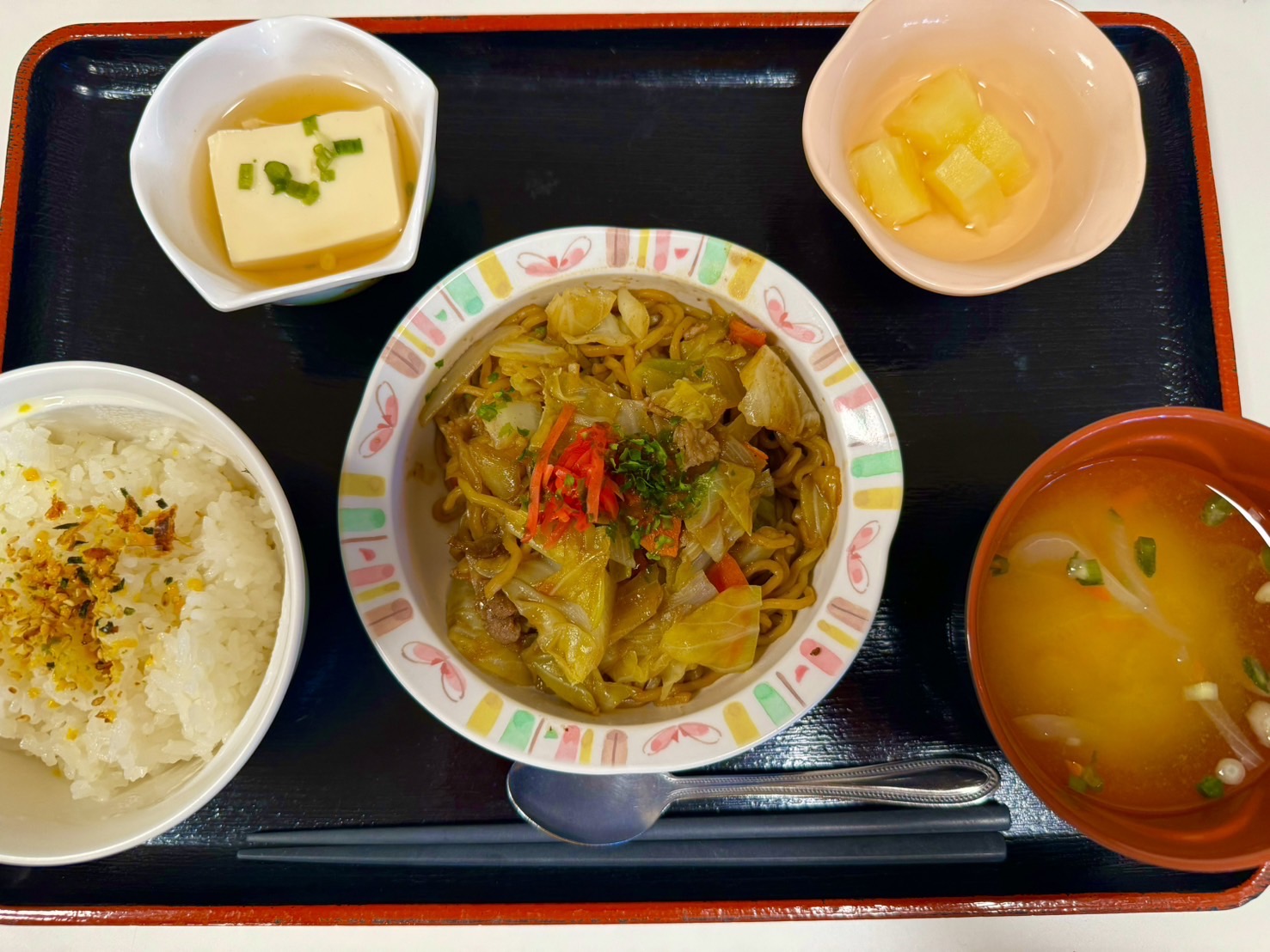【昼食】 1.ふりかけご飯(小) 2.焼きそば 3.煮奴 4.フルーツ缶 5.みそ汁