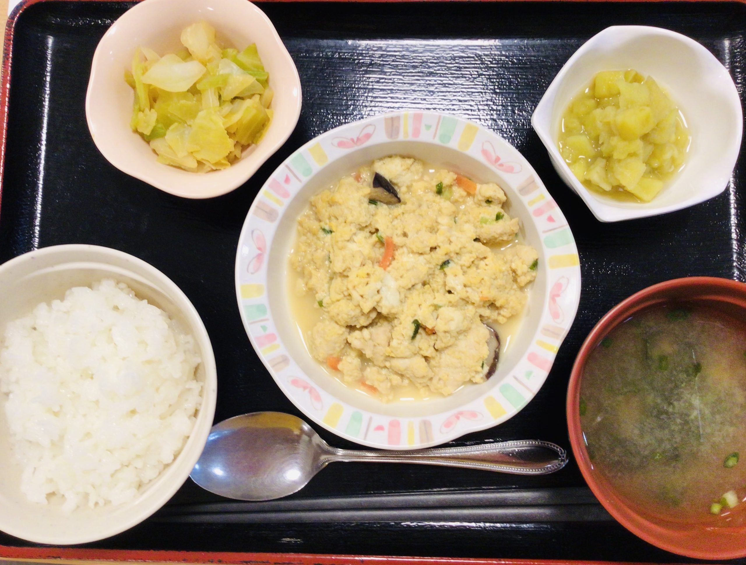 【昼食】 1.ご飯 2.炒り豆腐 3.さつまいもの甘煮 4.キャベツ生姜醤油 5.みそ汁