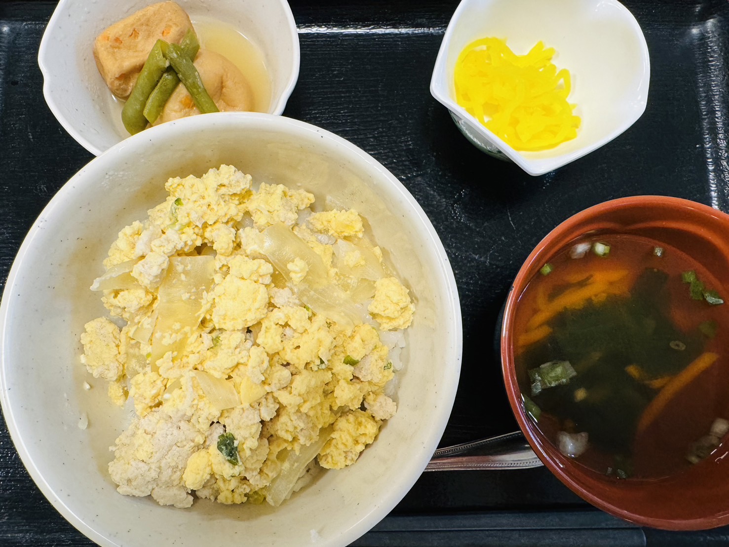 【昼食】 1.甘辛ミンチの卵とじ丼 2.がんもの含め煮 3.漬物 4.すまし汁