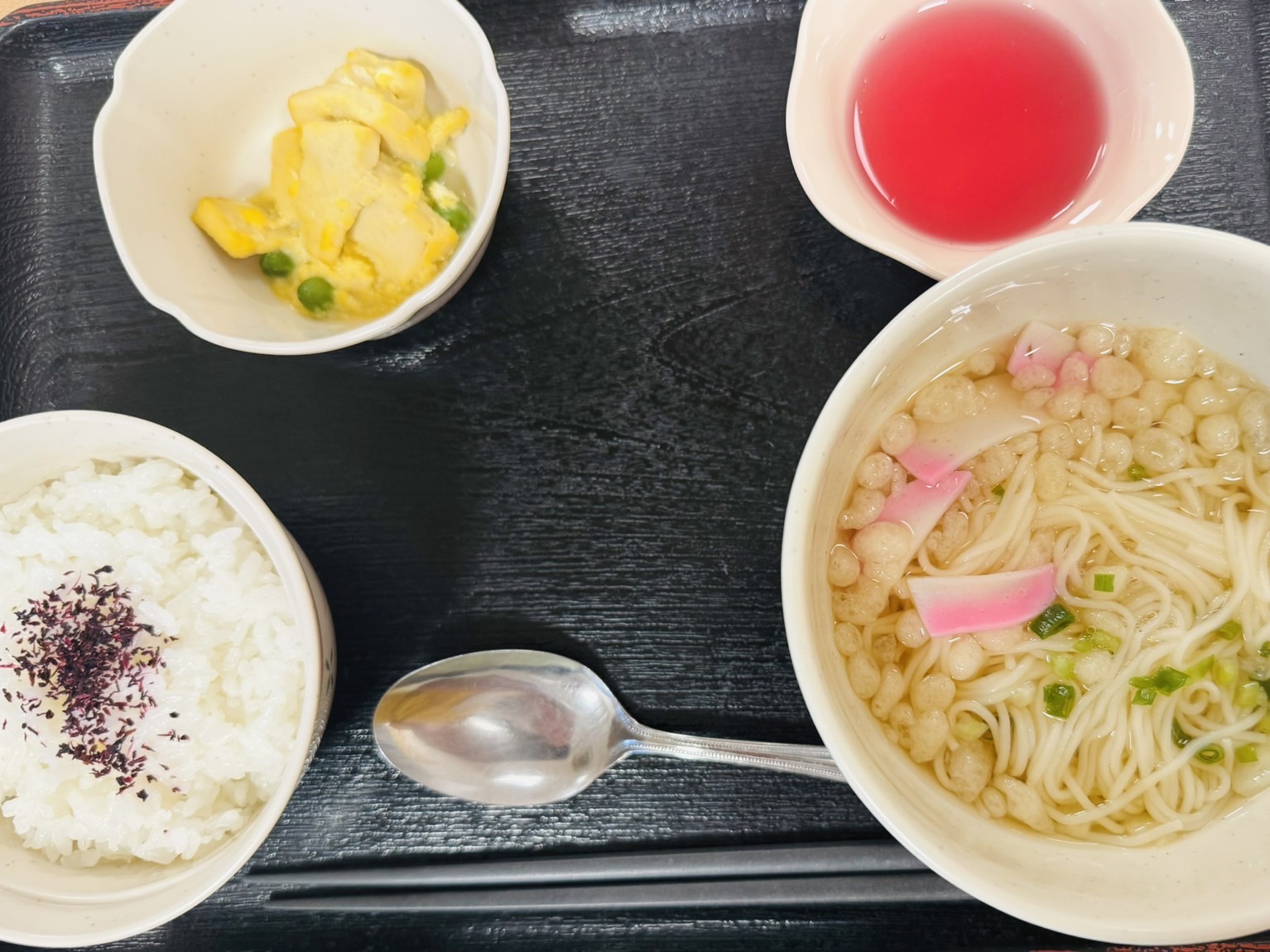 【昼食】 1.ゆかりご飯(小) 2.にゅう麺 3.高野豆腐の卵とじ 4.手作りゼリー