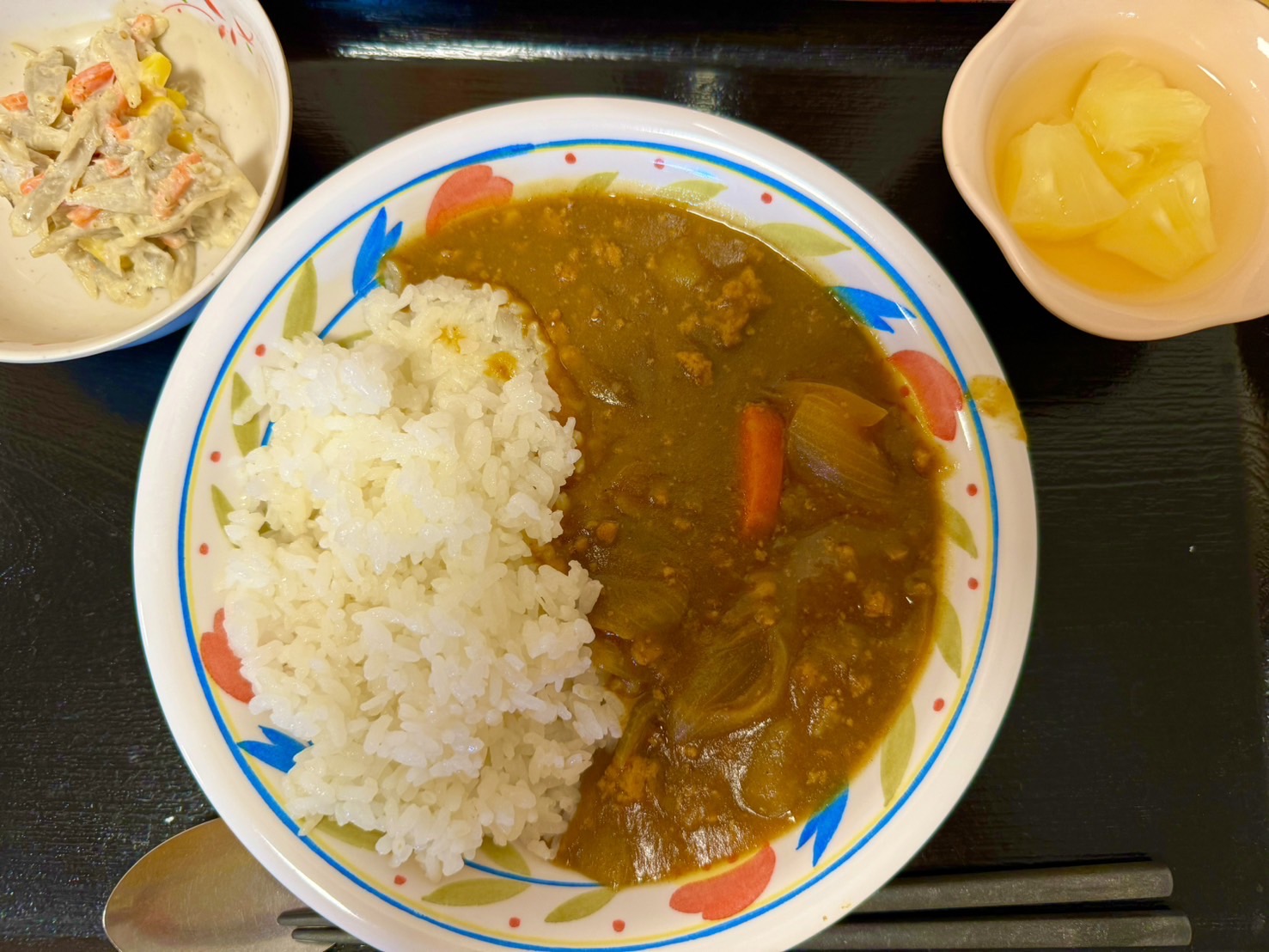 【昼食】 1.カレーライス 2.ごぼうサラダ 3.フルーツ缶