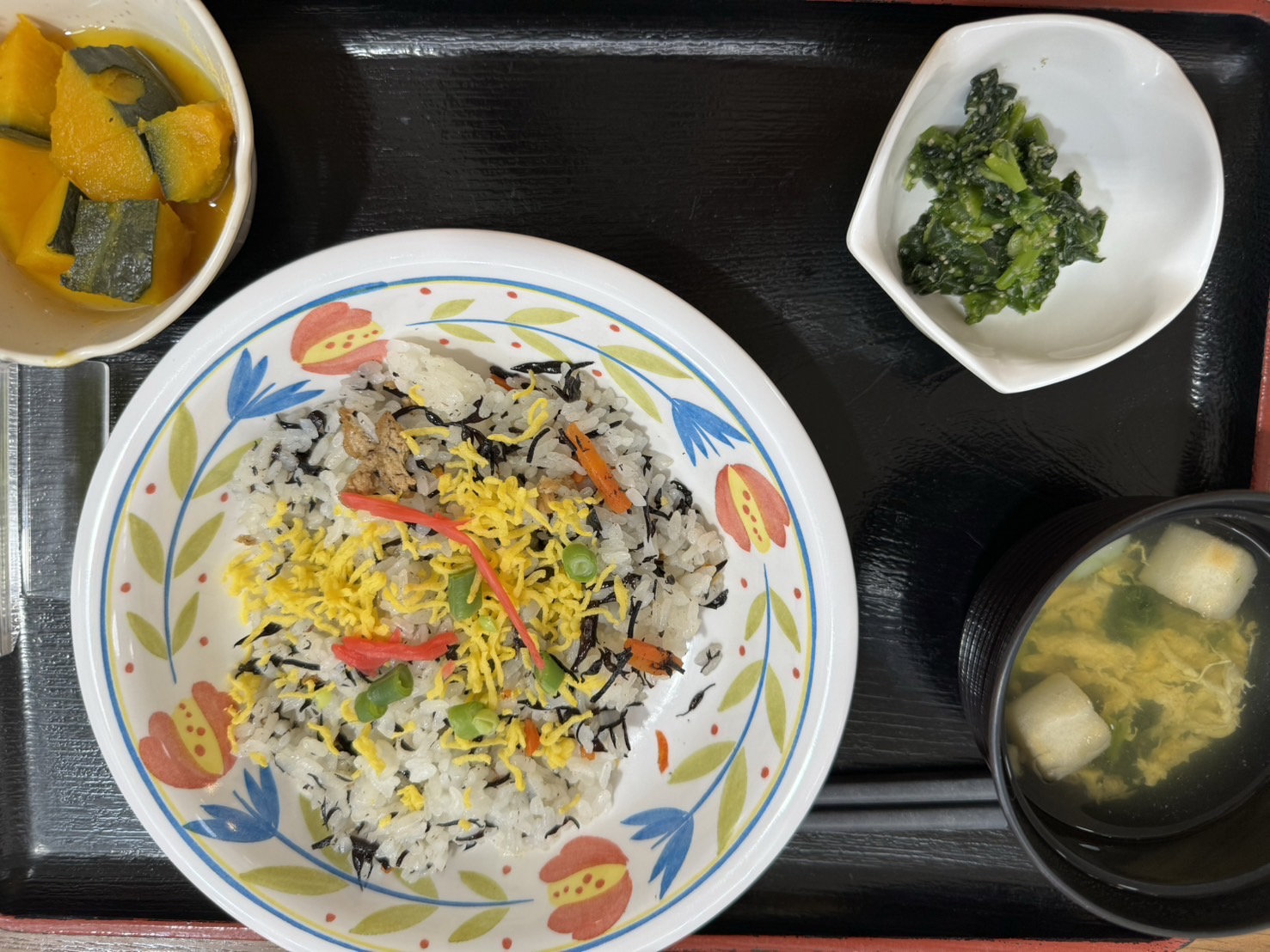 【昼食】 1.ひじきチラシ寿司 2.かぼちゃ煮 3.菜の花ごま和え 4.すまし汁