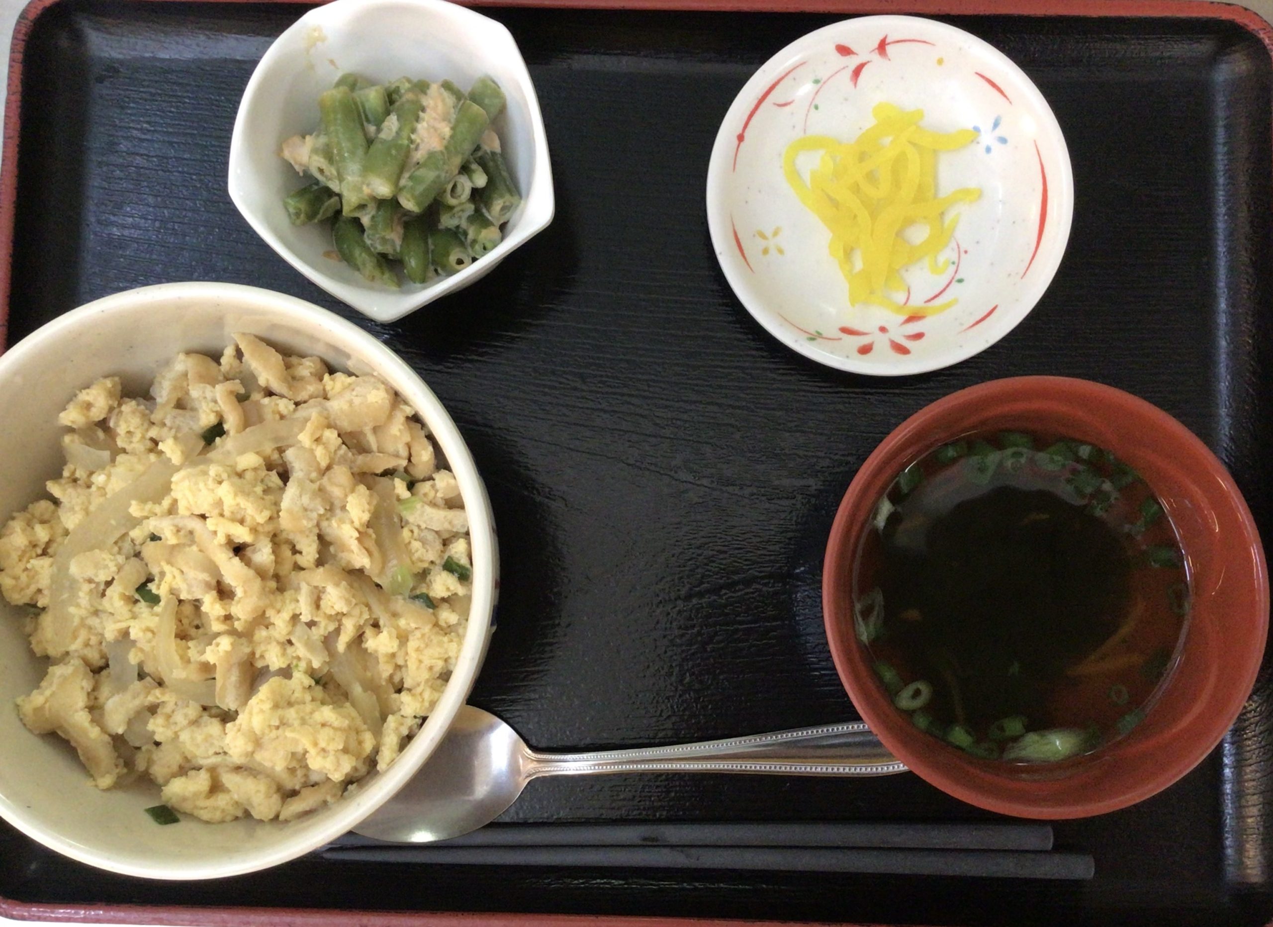 【昼食】 1.きつね丼 2.インゲンツナマヨ和え 3.漬物 4.すまし汁