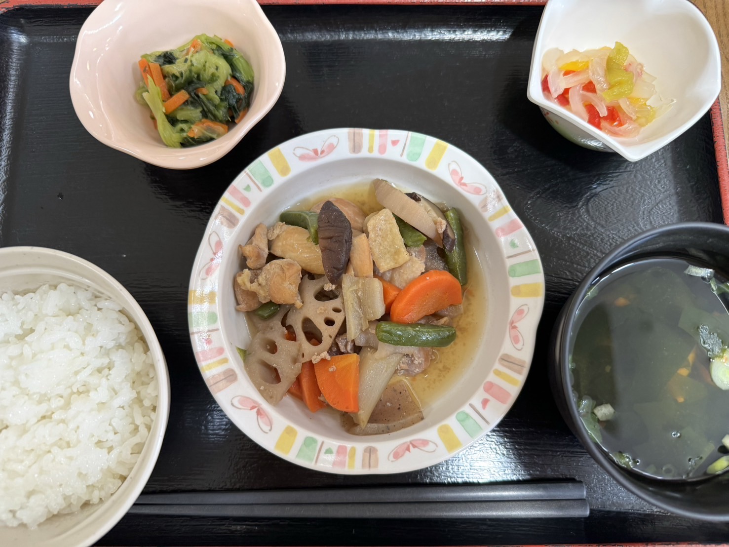 【昼食】 1.ご飯 2.炒り鶏 3.小松菜わさび和え 4.パプリカ甘酢 5.すまし汁