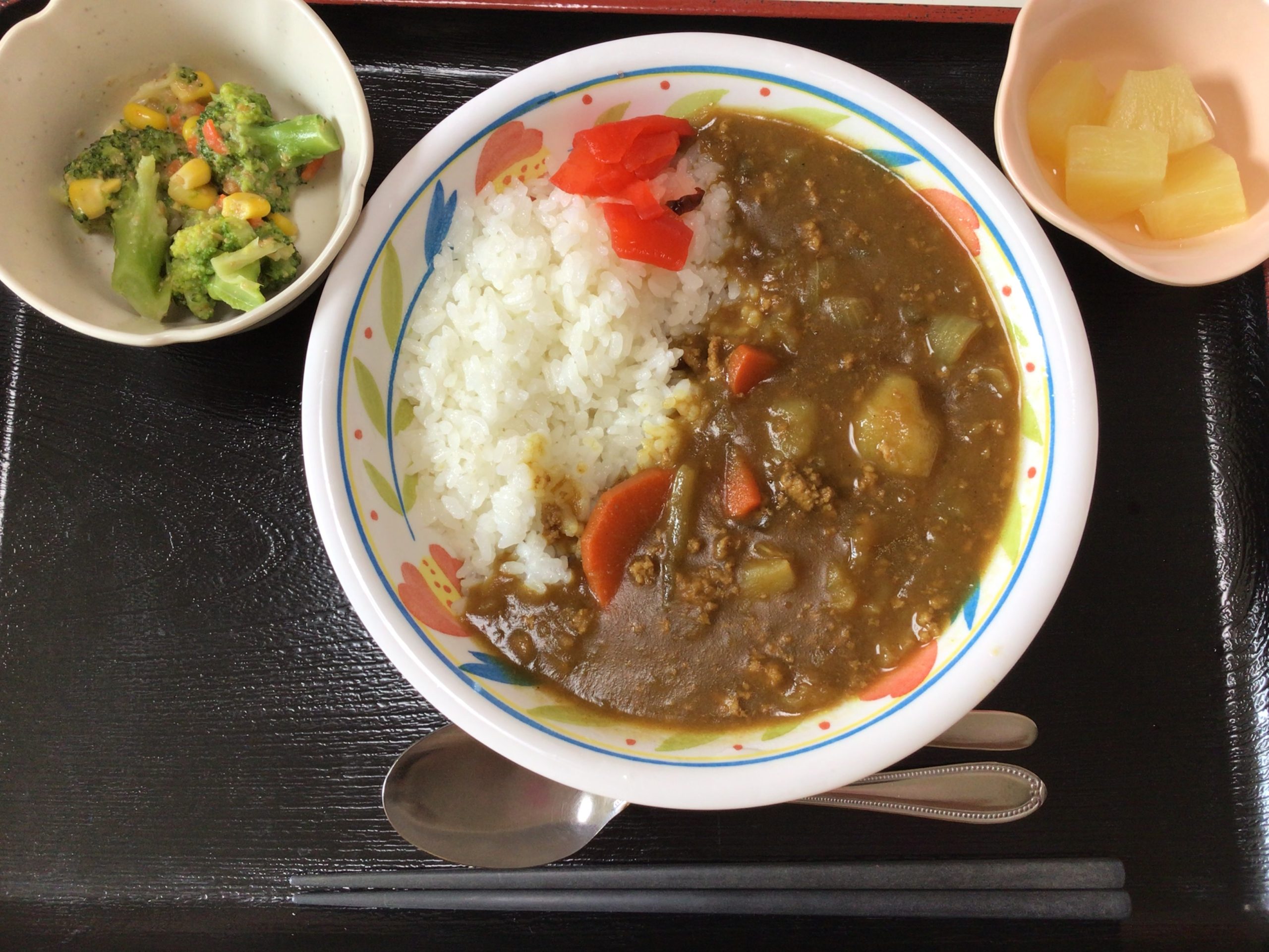 【昼食】 1.カレーライス 2.福神漬け 3.ブロッコリーゴマドレ和え 4.フルーツ缶